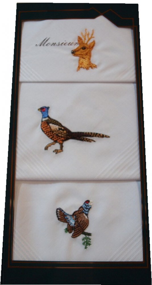 Kvalitní bavlněné kapesníky balené po třech kusech v krabičce. Kapesníky jsou vyrobeny z česané bavlny, rozměr kapesníků je klasický cca 40x40cm.