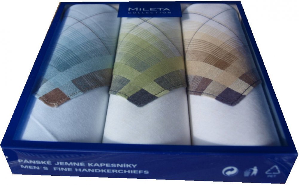 Pánské dárkové klasické bavlněné kapesníky jsou baleny v krabičce po třech kusech. Rozměr kapesníků je cca 40 cm x 40cm. Kapesníky jsou vyrobeny ze 100% bavlny. Samozřejmostí je česká tradiční výroba.