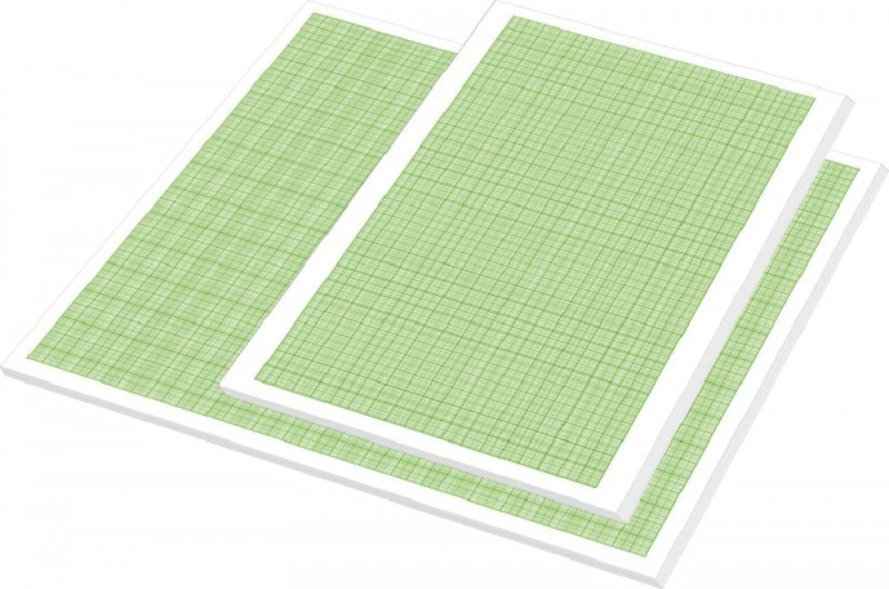 Bezdřevý papír s jednostranným potiskem milimetrovým rastrem s dělením po 1mm, 5mm a 10mm. Provedení v lepeném 20 ls bloku nebo volné listy balené po 100 ls.