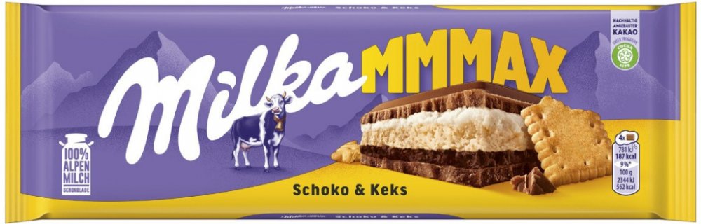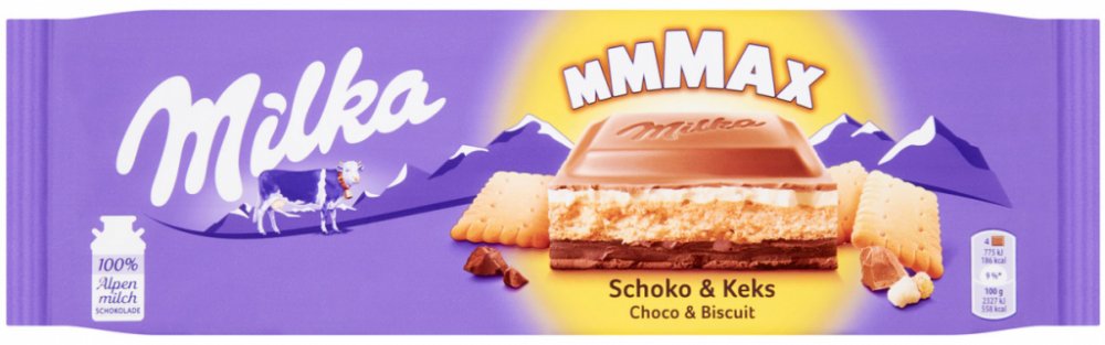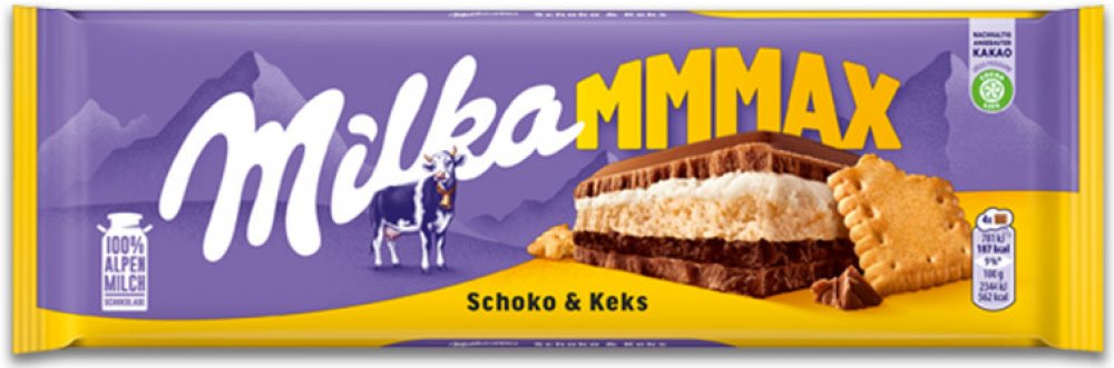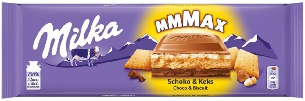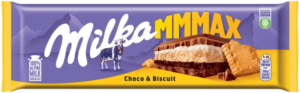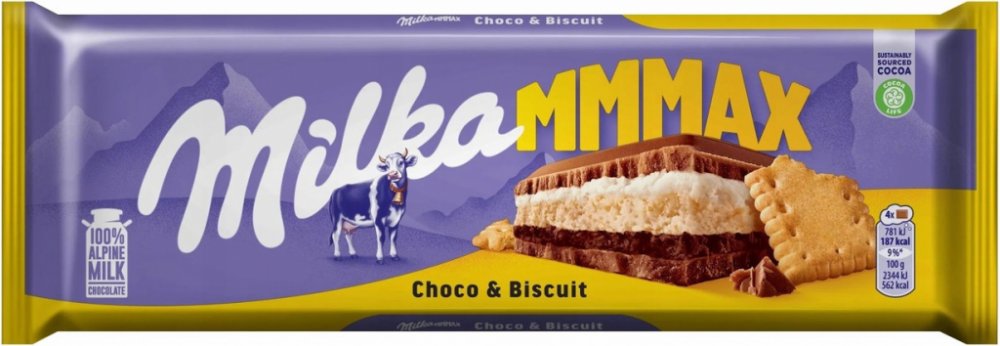 Dopřejte si luxusní zážitek s čokoládou Milka Mmmax Choco Biscuit. Tato velkoformátová tabulka je stvořená pro ty, kdo milují hru textur. Pod povrchem ikonické alpské mléčné čokolády se skrývá dvojité krémové srdce – jedna vrstva kakaová, druhá smetanová. O dokonalý kontrast se stará základ z křupavé máslové sušenky.