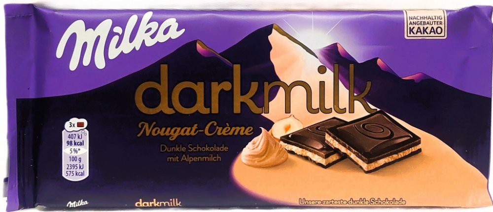 Tmavá čokoláda z alpského mléka s nugátovým krémem ( 40%). Jedinečná a lahodná chuť.