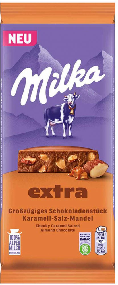 Extra verze mléčné čokolády Milka s kousky karamelu a mandlí.