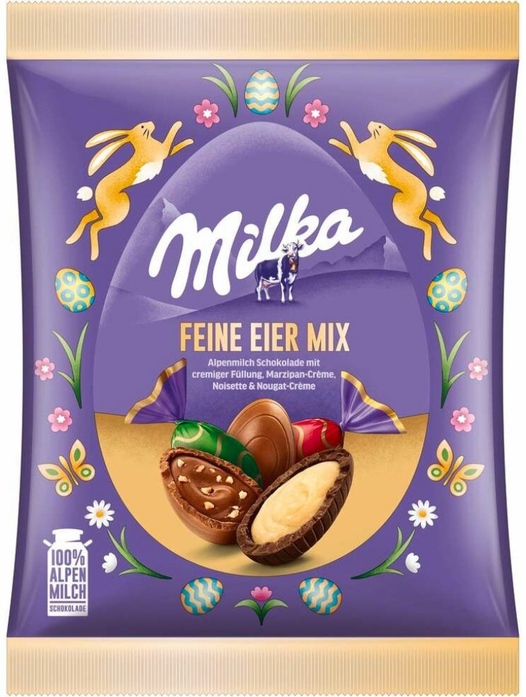 Směs alpského mléka , čokolády, plněného alpského mléka,čokolády a bílé čokolády