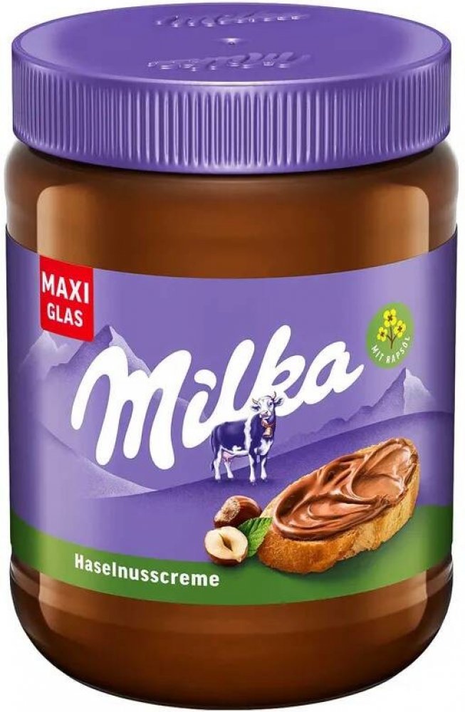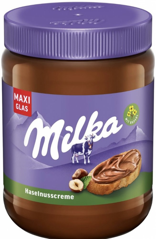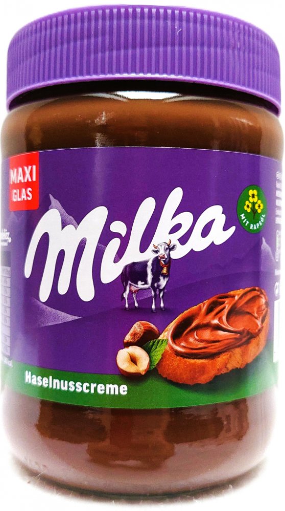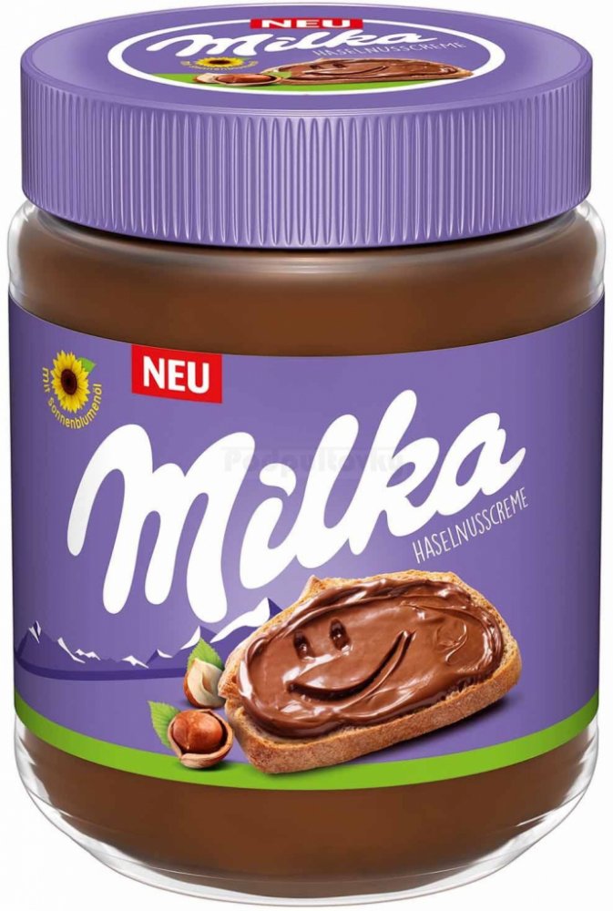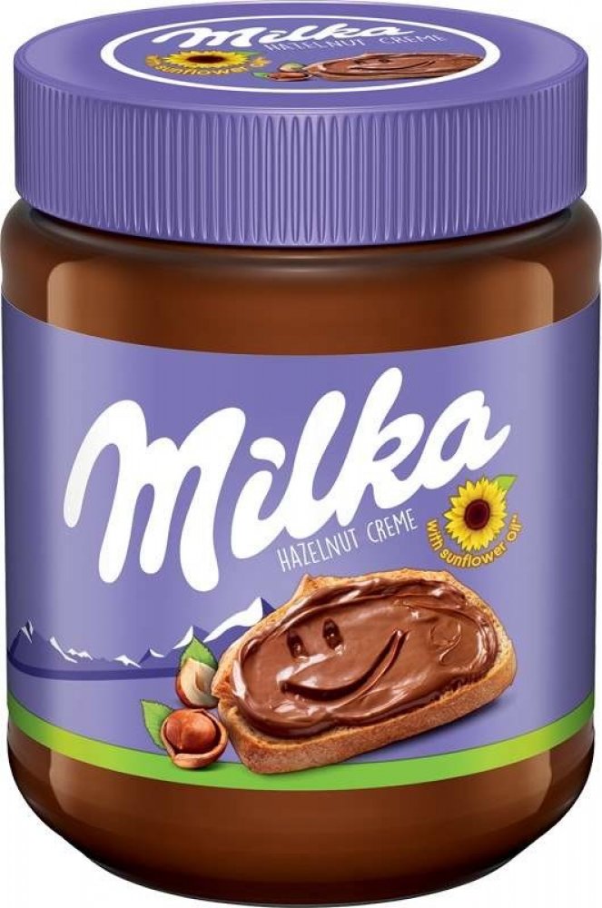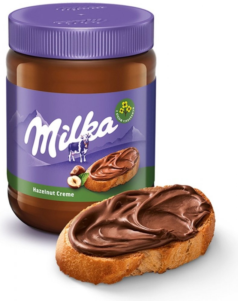 Excelentní pomazánka Milka, krém s lískovými oříšky a kakaem.