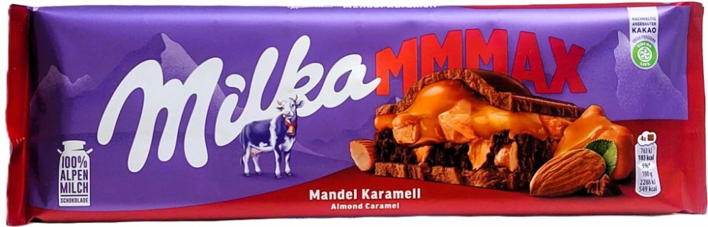 Mléčná čokoláda z Alpského mléka plněná mandlemi a karamelem.