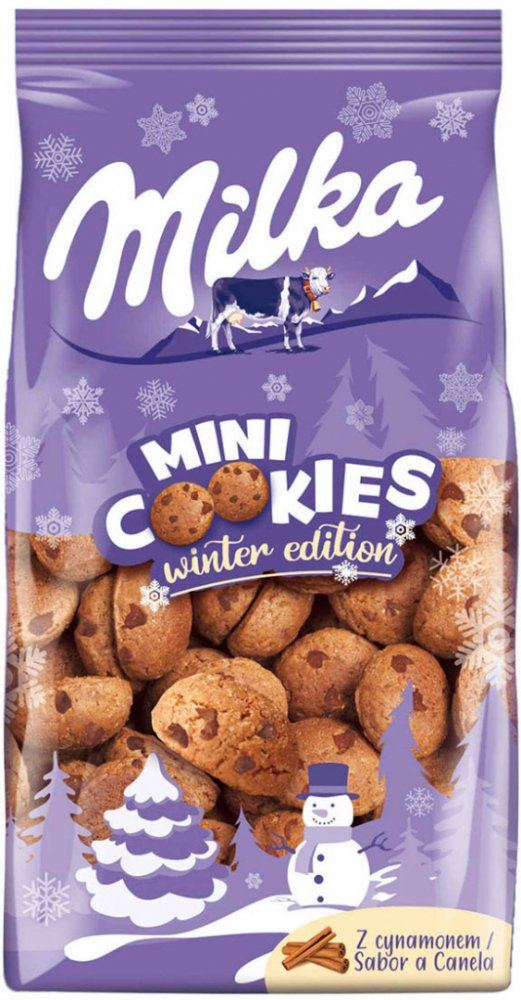 Polomáčené mini sušeneky Milka s kousky mléčné čokolády s příchutí skořice. Složení: pšeničná mouka, cukr, rostlinné tuky (palmový olej), hnědý cukr, sušené plnotučné mléko, kakaová hmota, kakaový tuk, sušená syrovátka, mléčný tuk, kypřící látky (uhličitan sodný, uhličitan amonný), glukózo-fruktózový sirup, invertní cukerný sirup, glukózový sirup, skořice (0,2%), dextróza, zvhlčovadlo (glycerol), ...