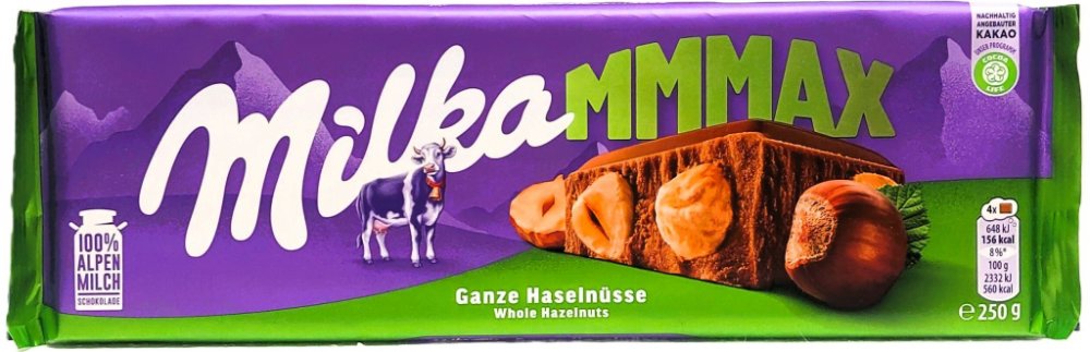 Čokoláda z alpského mléka s celými lískovými oříšky.