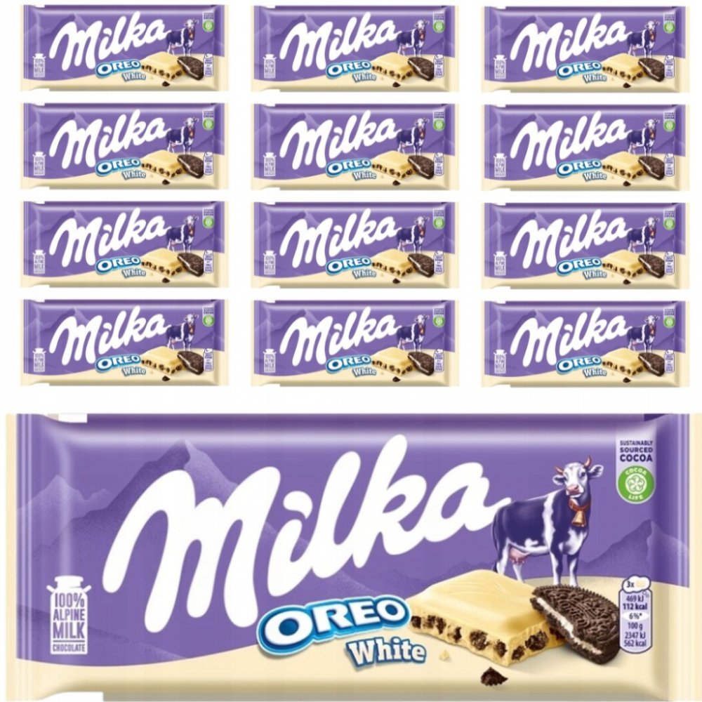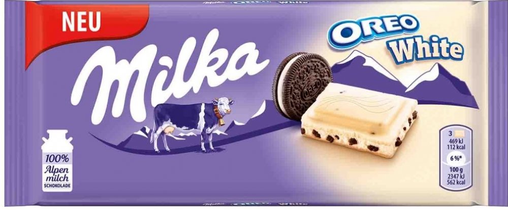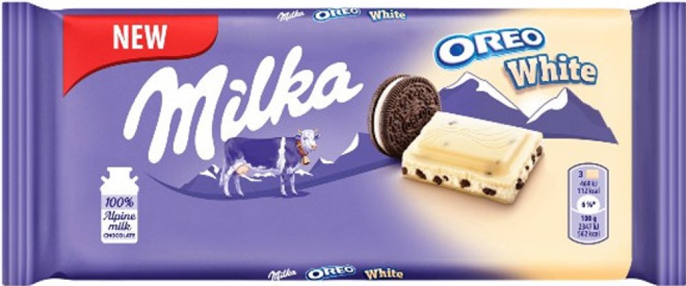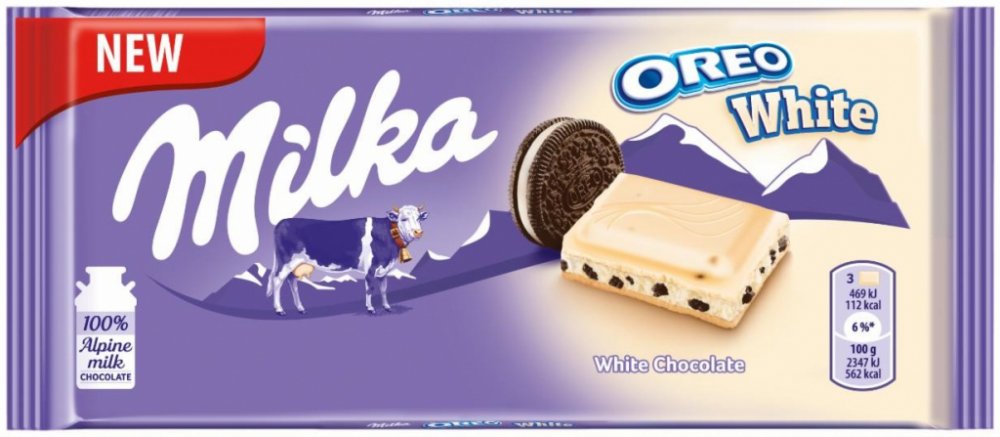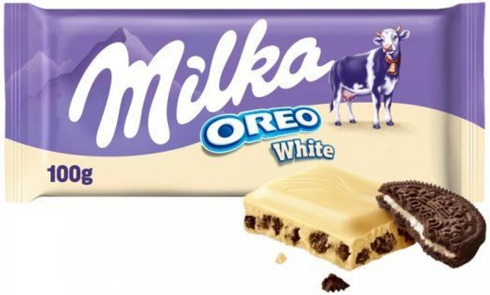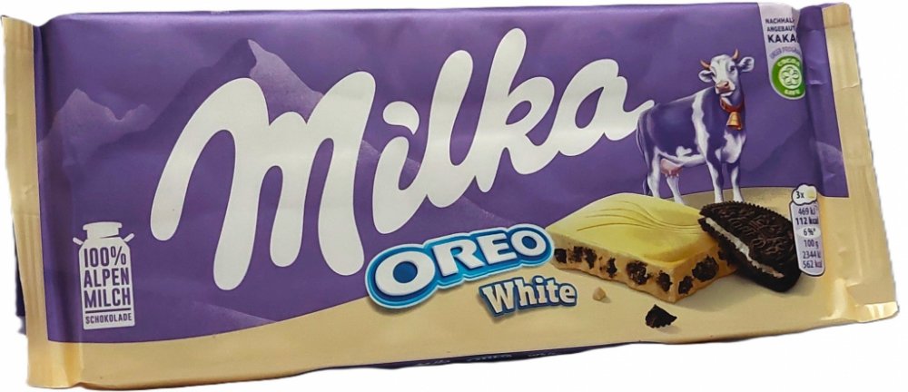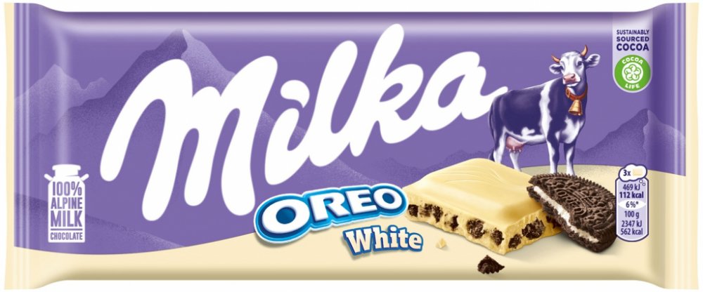 Milka Oreo White je čokoládový požitek z bílé čokolády Milka a křupavých originálních kousků sušenek Oreo.