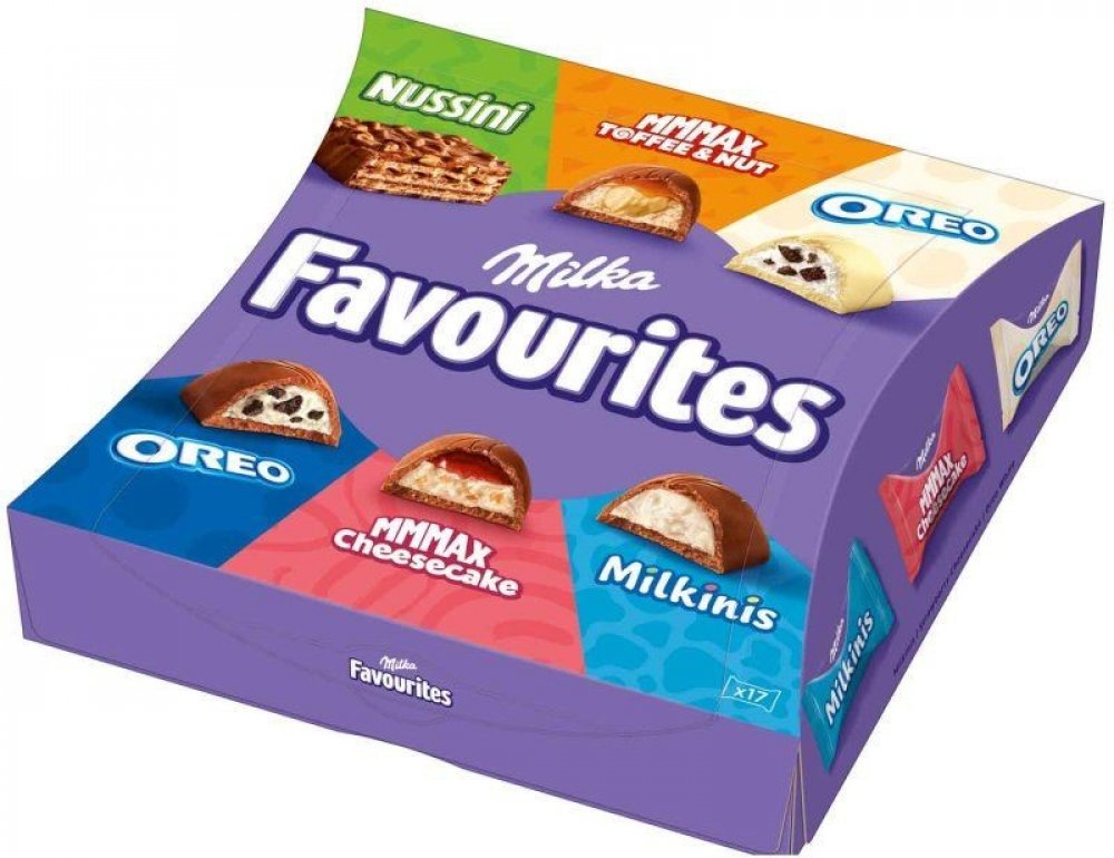 Objevte lahodnou řadu jemných Milka Favourites: Nussini, Mmmax Toffee Nut, Oreo White, Oreo, Mmmax Cheeseckake a Milkinis.Každý fanoušek Milky najde svou oblíbenou příchuť individuálně zabalenSložení:Cukr, rostlinné tuky (palmový, bambucký, palmojádrový), kakaové máslo, sušené odstředěné mléko, sladká sušená syrovátka (z MLÉKA), PŠENIČNÁ MOUKA, kakaová hmota, MÁSLA SMETANA, LÍSKOVÉ OŘECHY, glukózo...