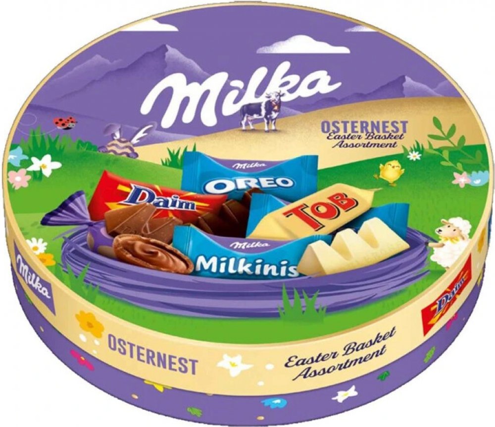 Milka & přátelé nadílka 196g Velikonoční dárková krabička se směsí čokolád Balení má průměr cca 17,5 cm a obsahuje tyto sladkosti: 4× Milka Zarte Momente Oreo 4× Milka Zarte Momente Alpenmilch 2× Toblerone mini Dark 2× Toblerone mini White 2× Toblerone mini Classic 4× Milka Mini Täfelchen 4× Daim…