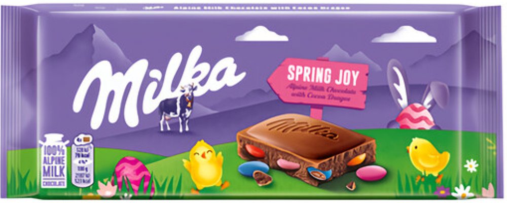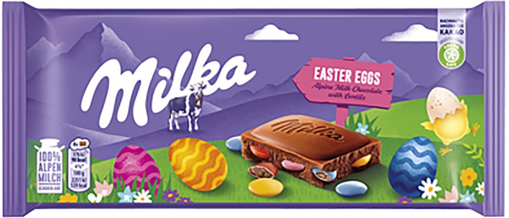 -- Mléčná čokoláda z alpského mléka s kakaovým dražé (20 %).Milka Velikonoční mléčná čokoláda s lentilkami spojuje jemnou alpskou mléčnou čokoládu s křupavými barevnými kousky kakaových dražé. Hravá kombinace chutí a veselý jarní design z ní dělají…