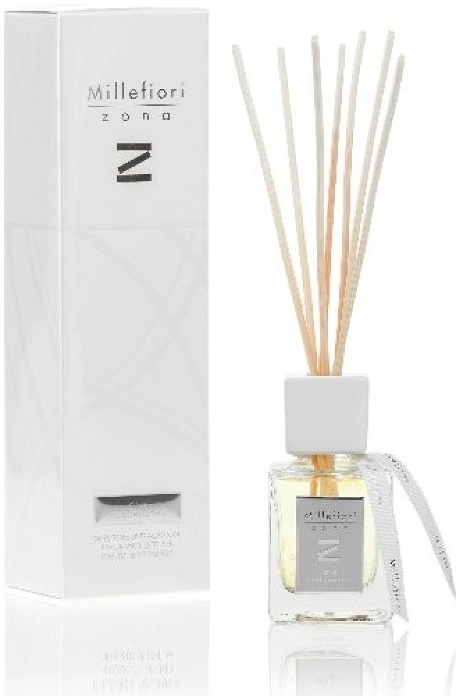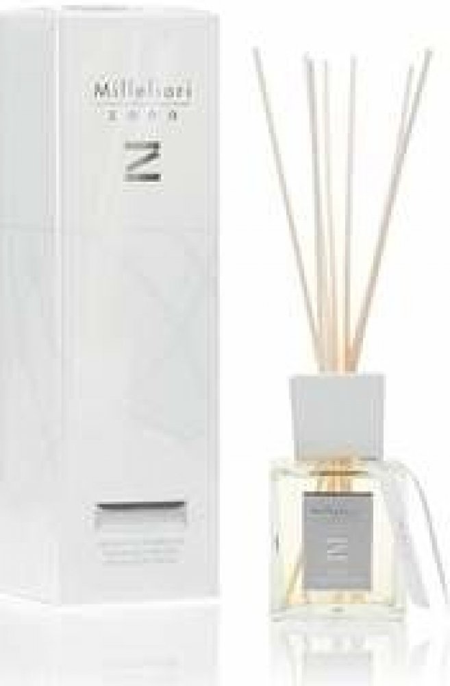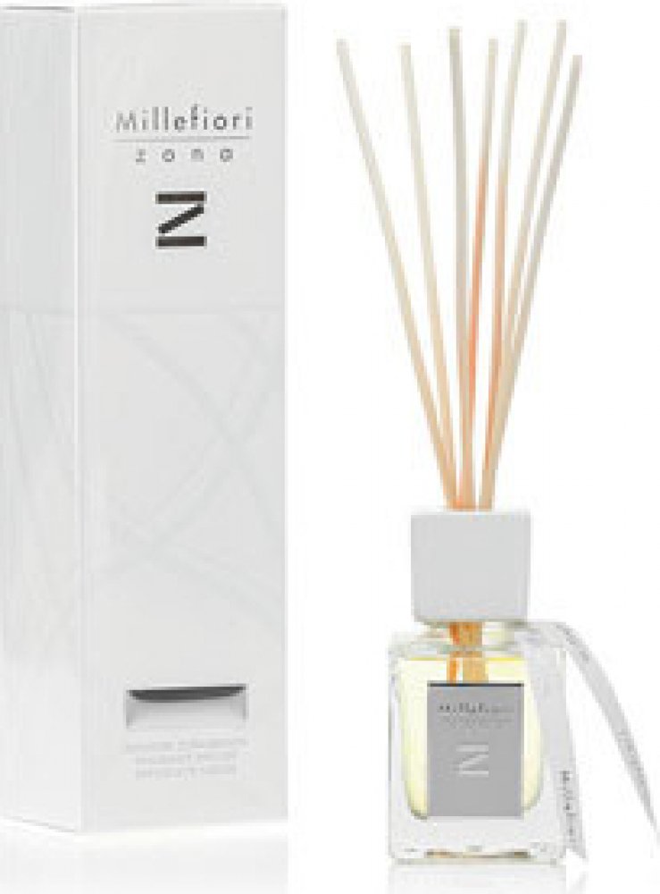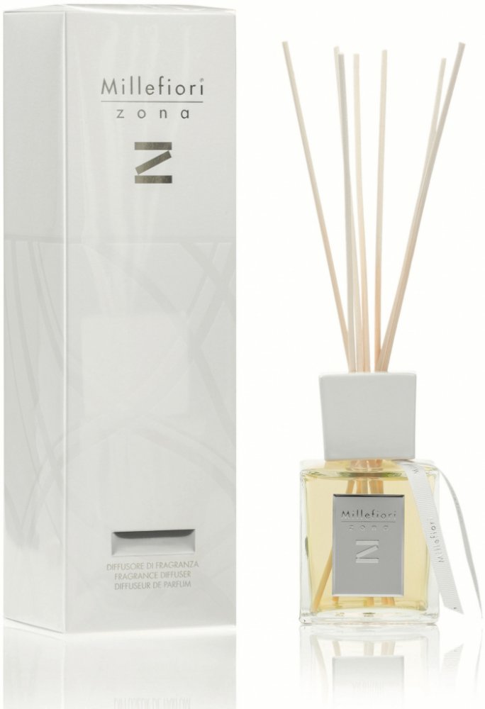 Difuzér s tyčinkami Millefiori® z kolekce Zona kombinuje maximální sofistikovanost vůně a designu pro náročné zákazníky. Elegantní flakon ze silnostěnného skla doplňuje kovová etiketa a bílá keramická koncovka se stuhou. To vše pečlivě zabaleno v luxusním dárkovém balení, které je radost otevřít. Do nádoby stačí vložit tyčinky a vůně se začne uvolňovat do prostoru.