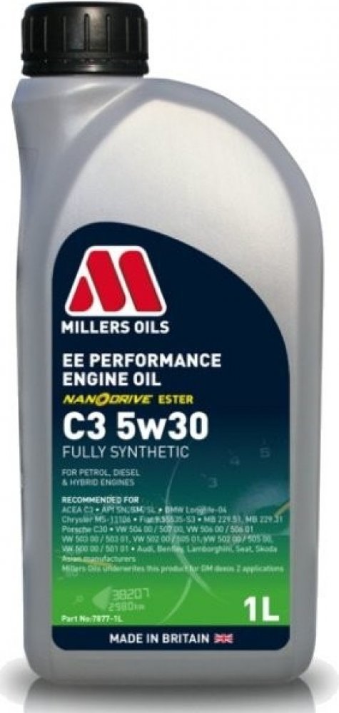 APLIKACEMotorový olej Millers Oils vhodný pro motory vyžadující olej ACEA C3 5w30 a široký rozsah použití včetně motorů koncernu Volkswagen Audi Group (VAG), zahrnující také Lamborghini, Seat, Škoda a Porsche. Pokrývá také aplikace dalších automobilek včetně BMW a Mercedes Benz. Je plně kompatibilní se systémy a standardy úpravy výfukových zplodin – DPF (diesel particulate filter), GPF (gasoline p...