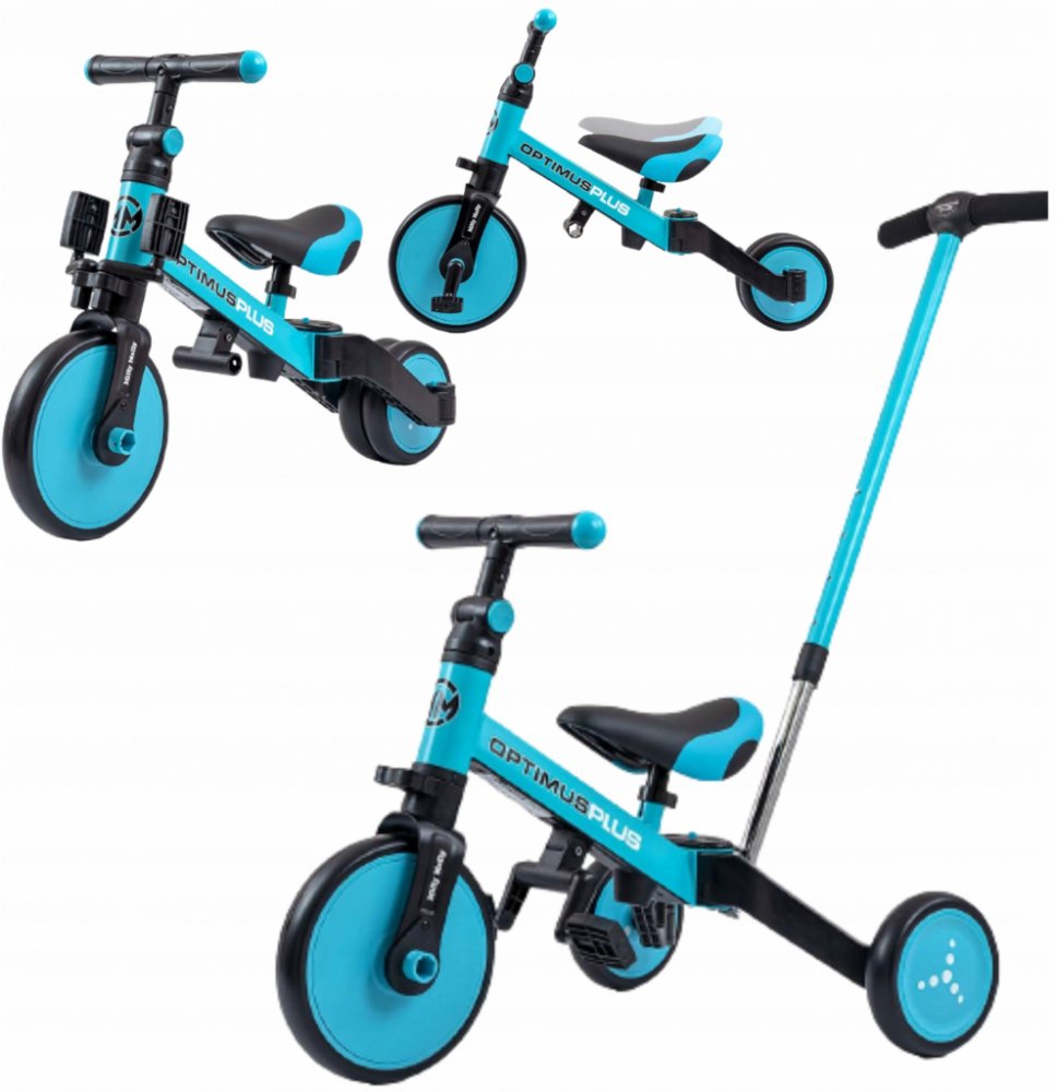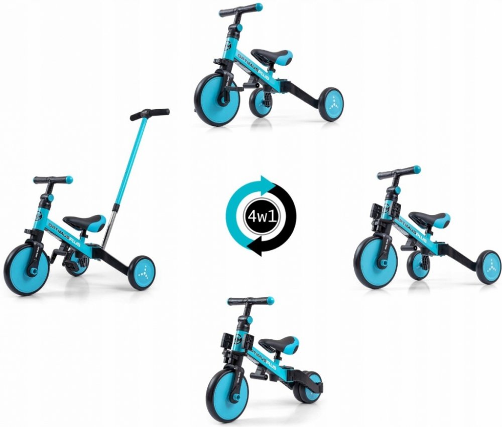 Univerzální dětská šlapací tříkolka Milly Mally 4v1 Optimus byla navržena tak, aby se stala tím nejlepším co můžete nabídnout svému malému závodníkovi. Díky stabilní konstrukci poskytuje dítěti maximální úroveň bezpečnosti a tímto mu usnadňuje získávání nových dovedností. Největší výhodou této tříkolky je její variabilita. Jakmile dítě získá základy jízdy, připojíme pedály nebo jí během okamžiku změníme na klasické jednostopé odrážedlo. Pěnová kola výborně absorbují rázy, poskytují dobrou přilnavost, zajistí pohodlí během jízdy a neunaví vašeho malého závodníka. Dostatečný rozvor kol poskytuje mimořádnou stabilitu, bezpečnost během používání doma i venku. Doraz nedovolí přetočení řídítek.