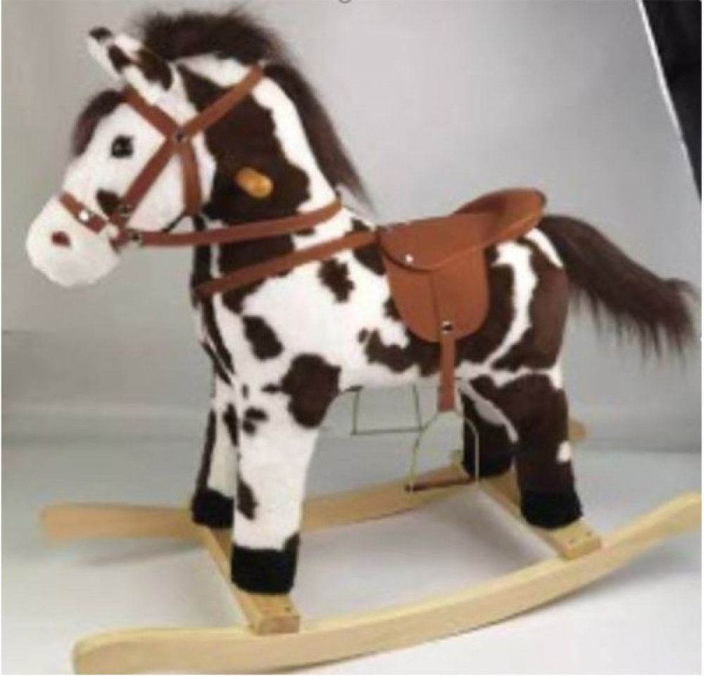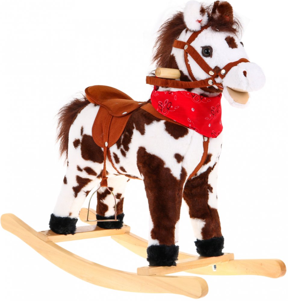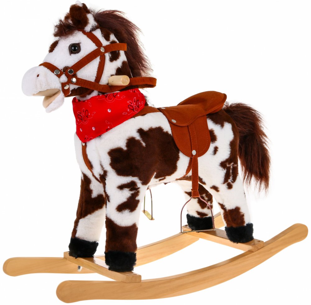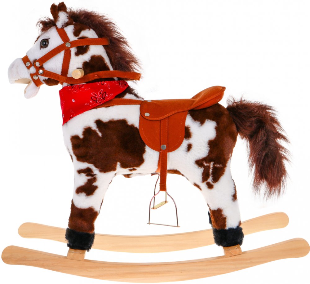 Tento měkký plyšový houpací koník se zvukovými efekty je určen pro děti od 3 let. Kůň má profilované sedlo se třmeny, otěže, dřevěné běhouny, dvě dřevěná držadla a červený šátek kolem krku. V pravém a levém uchu koně jsou senzory, které po stisknutí aktivují zvuky cválajícího koně a zvuky řehtání. Navíc kůň pohybuje tlamou a ocasem. Hračka je napájena 3 x AA 1,5V bateriemi (nejsou součástí balení)...