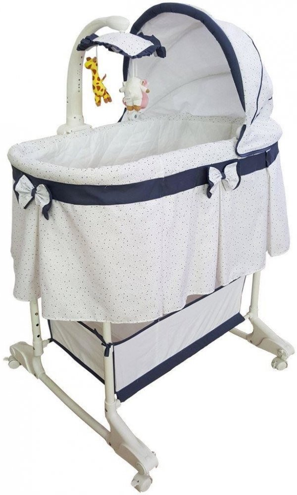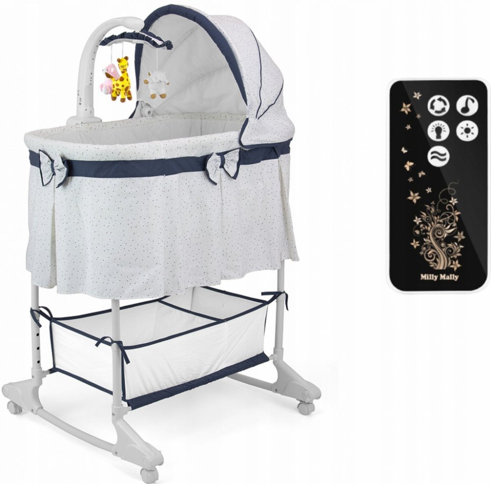 Charakteristika:- nastavení výšky do 4 poloh- odnímatelná, regulovatelná stříška- kolotoč s veselými plyšovými hračkami, melodií a noční lampičkou- možnost regulace intenzity světla lampičky a hlasitosti přehrávaných melodií- včetně dálkového ovladače pro ovládání melodií a světla- funkce vibrací- praktický koš na pleny a další příslušenství pro miminko- měkká matrace součástí postýlky- vnější dekorace s volánkem- stahovací bočnice pro snadnější přebalování miminka- potah lze prát v pračce- vhodná pro miminka do 6 měsíců (8 kg)- rozměry: délka: 87cm, šířka: 47cm, hloubka: 27cm, výška: 135cm (regulovatelná)rozměr matrace: délka cca 79 cm, šířka cca 41 cmNapájení kolotoče zajišťují 3 baterie typu C (nejsou součástí)