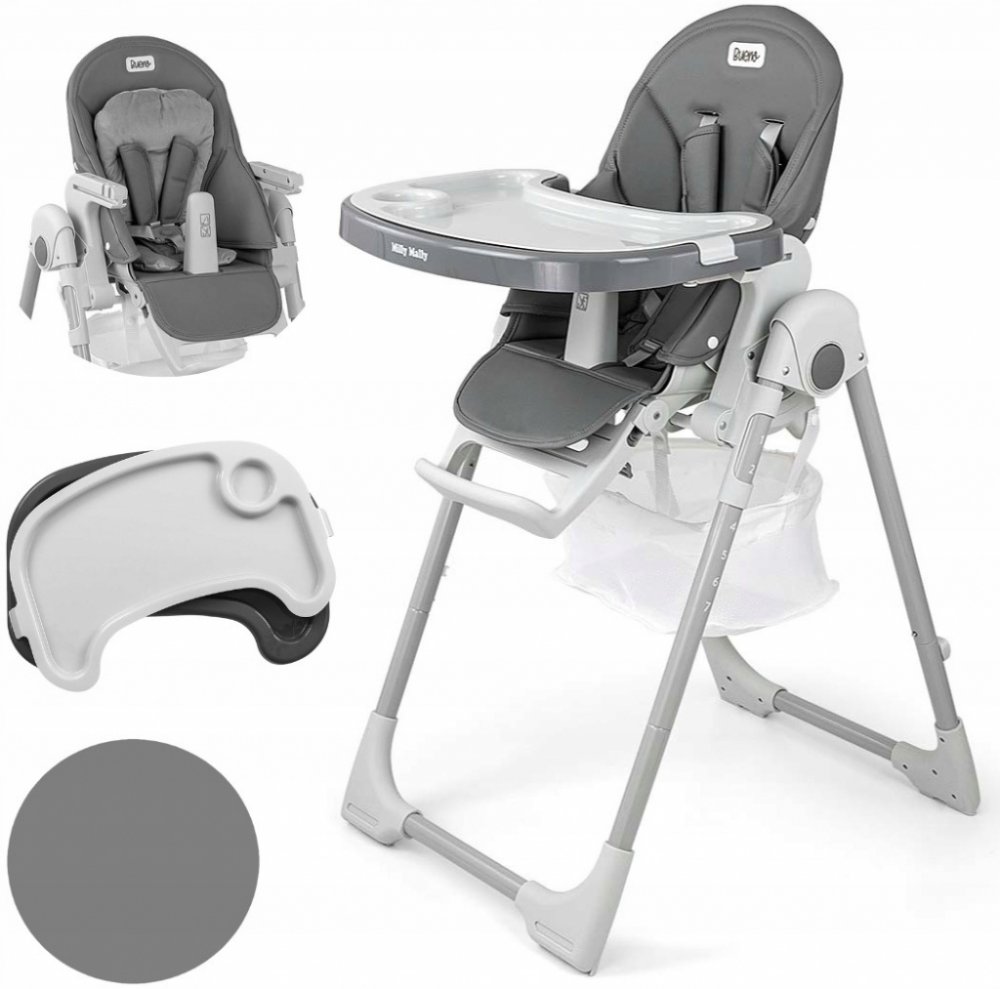 Čalounění židle je vyrobeno z ekologické kůže a má navíc měkkou vložku pro nejmenší. Pro bezpečnost dítěte je vybavena 5-ti bodovými nastavitelnými pásy a přídavnou zábranou proti uklouznutí. Na zadní straně opěradla je úchyt pro zavěšení tácu. Opěradlo i podnožku lze sklopit do lehu. Sedák lze zvednout nebo snížit v 7 stupních a nohy mají zabudovaná gumová kolečka. Celou konstrukci lze snadno a hladce složit.