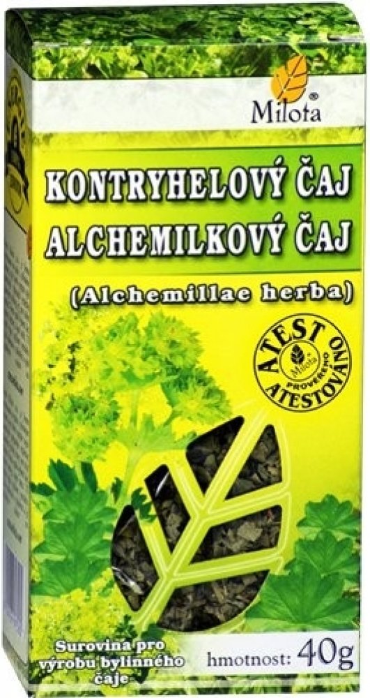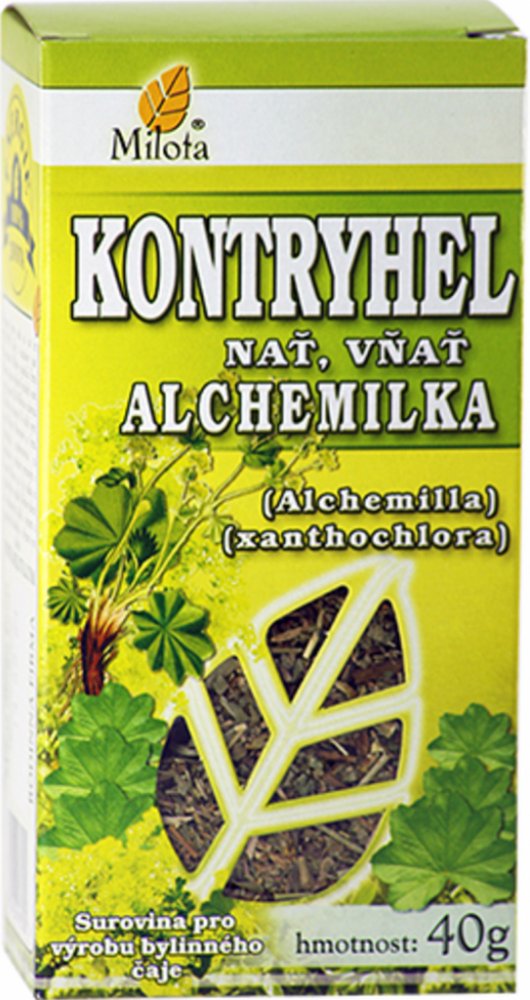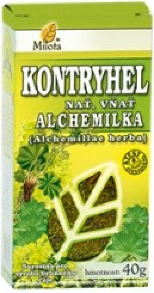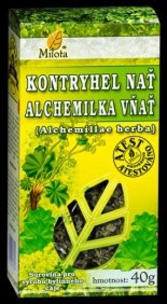 Milota Kontryhel nať 40g x: V lidovém léčitelství se Kontryhel nať používá na zlepšení trávicích pochodů, na uklidnění, k uvolnění křečí při průjmech, silné menstruaci a preventivně k ulehčení přechodu.Zevně se používá k ošetření hnisavých ran, k výplachům úst při zánětech dásní a aftech, k přípravě sedacích koupelí při hemeroidech a poševním výtoku a v obkladech při očních zánětech.Kontryhel obsahuje třísloviny (až 8% - důležitá je zejména přítomnost katechinových tříslovin, tanin), hořčiny,
