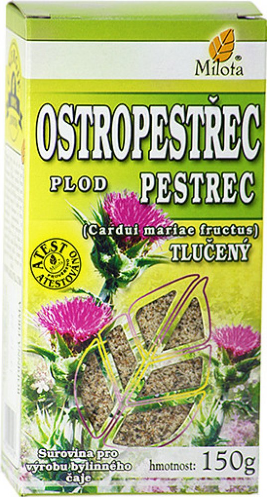 Ostropestřec mariánský plod (Silybum marianum, Cardui mariae fructus) - 150 g (surovina pro výrobu bylinného čaje, surovina pro individuální užití) Bylinář J. A. Zentrich píše o ostropestřci: Droga: Užívá se výhradně semeno. Obsažené látky: Hlavní obsahovou látkou je silymarin, což je souhrnný název pro flavanolignanové sloučeniny a silici. Dále jsou přítomny flavonoidy, taxifolin a steroly, také biogenní aminy tyramin a histamin, některé aminokyseliny, sacharidy a olej s vyšším podílem nenasycených mastných kyselin. Nalezeny byli i kvercetin, dehydroflavonol taxibolin a opticky aktivní dehydrokoniferil. Minerály a vitamíny: vápník - 3.260 mg% - chrom 0,1 - kobalt 1,5 - hořčík 80,0 - mangan 0,3 - fosfor 12,0 - draslík 185 - selen 0,02 - křemík 0,84 - cín 0,37 - zinek 0,07 - vit.A 700 mj. - vit.C 18 - niacin 0,6. Účinnost: Semeno se řadí k nejlepším jaterním lékům, kdy játra detoxikuje a podporuje regeneraci jaterního parenchymu. Příznivě ovlivňuje tvorbu žluči a její distribuci. Zlepšuje látkovou výměnu. Výrazně přispívá k vnitřní léčbě lupénky, má silnou antioxidační aktivitu a tím chrání organismus před nádorovým onemocněním. Působí protizánětlivě. Zlepšuje stav jater po toxickém napadení, včetně abúzu alkoholu. Zvyšuje sekreci mateřského mléka, která potom příznivě ovlivňuje vyvíjející se imunitní systém miminka. Kontraindikace: Droga je prakticky netoxická. Její podávání v těhotenství je možné a při laktaci velmi výhodné. Jediným nebezpečím je možné žluknutí semen, zejména mletých; potom játra neléčí, ale spíše zatěžují. Forma: Čajová forma se pokládá za méně vhodnou pro špatné vyluhování léčívých látek do vody. Etanolická nebo etanolicko-glycerínová tinktura je lékem účinnějším, ale u řady nemocných je rovněž méně vhodná pro jistý, byť malý přísun alkoholu. Nejúčinnější lékovou formou se tak jeví prášek z čerstvě mletých semen, smíchaný s mléčným cukrem (laktózou), náhradně s cukrem ovocným (fruktózou) a v krajním případě lze tolerovat i smíchání s cukrem hroznovým (glukózou) - v poměru 2 dílů (objemových nebo hmotnostních) prášku na 1 díl cukru. Dávkování 2-4x denně 1 mírně navršená čajová lžička, brát před jídlem nebo mezi jídly, zapíjet měsíčkovým, řepíkovým nebo vřesovým thé, případně i vodou. Prášek by neměl být starší 4 dnů od pomletí semene. Zdroj: Encyklopedie moderního bylinářství. O ostropestřci se dočtete také zde.