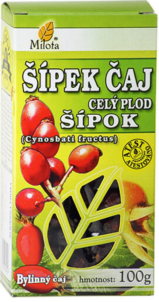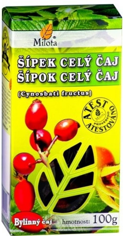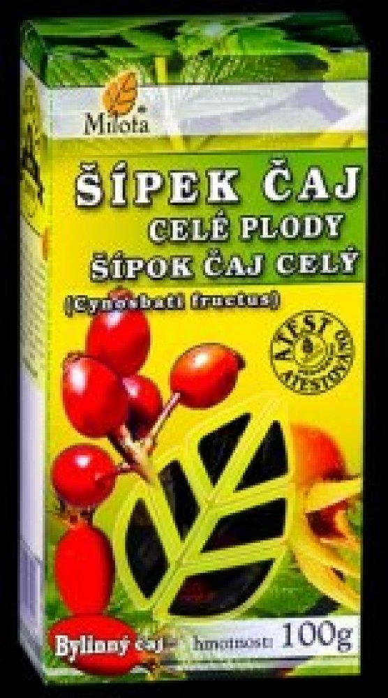 Složení: Cynosbati fructus (rosa canina). Nařízením EU je zakázáno uvádět na obalu výrobku jakékoliv zdravotní účinky. Více informací o zdravotních účincích byliny najdete v našem herbáři. VIZ ZDE: http://herbar.milota.com/rostlina/sipek-plod-cely-100g . Důležitou obsahovou látkou je vitamín C, jehož obsah kolísá mezi 300 mg u přezrálých a 700 mg u plně zralých plodů. Dále zde nacházíme beta karoten, vitamíny skupiny B, třísloviny, kyseliny citrónovou a jablečnou, cukry, slizy, a přibližně 4% minerálních látek, z nichž polovinu tvoří draslík a vápník. Obsaženy jsou též flavonoidy, pektin, stopy silice. Šípkový likér: 1,5kg plodů a 500 g. tmavého cukru necháme ve 3 litrech žitné 8 dnů vyluhovat a pak přecedíme. Užívání: 3 čajové lžičky na 2dl vařící vody, vařit 1 min. vyluhovat 10 minut. Popíjet 3x denně. Výrobce: Milota s.r.o., Záhumení 168, 74285 Vřesina, www.milota.com, milota@milota.comZemě původu: Česká republika