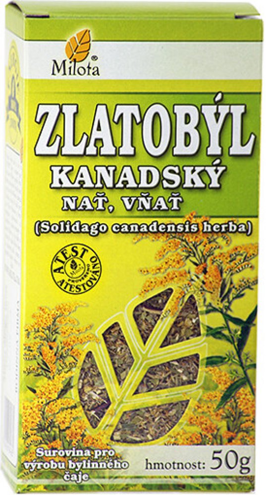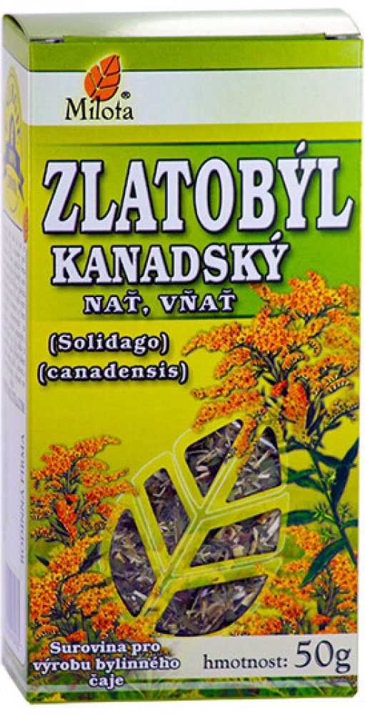 Složení: Solidago canadensis herba. Nařízením EU je zakázáno uvádět na obalu výrobku jakékoliv zdravotní účinky. Více informací o zdravotních účincích byliny najdete v našem herbáři. VIZ ZDE: http://herbar.milota.com/rostlina/zlatobyl-kanadsky-nat-50g . Droga obsahuje saponiny s hemolytickým účinkem, glykosidy, hořčiny, glykosilanové flavonoidy, kyselinu nikotinovou, kávovou, chlorogenovou, skořicovou, seskviterpenoidy, diterpenoidy a další složité látky. U nás se můžeme běžněji setkat se třemi druhy zlatobýlů (z. kanadský, z. obecný, z. celík a z. obrovský), od zbylých dvou tento druh odlišíme tak, že jazykovité květy jsou sotva delší než trubkovité, kdežto u zbylých dvou jsou zřetelně delší. Užívání: 2 čajové lžičky na 2dl vody, vyluhovat 10 minut. Popíjet 2 - 3x denně. Výrobce: Milota s.r.o., Záhumení 168, 74285 Vřesina, www.milota.com, milota@milota.comZemě původu: Česká republika