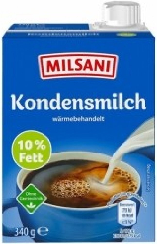 Milsani - Kondenzované mléko, 10 % tuku, obsah 340 g. Dovezeno z Německa.