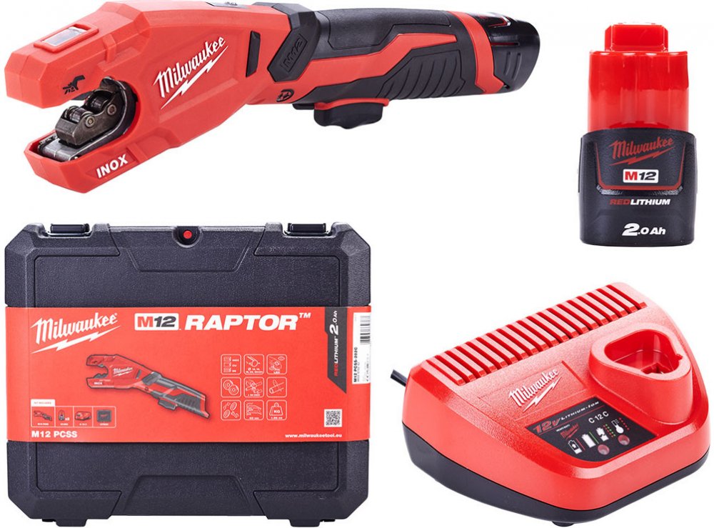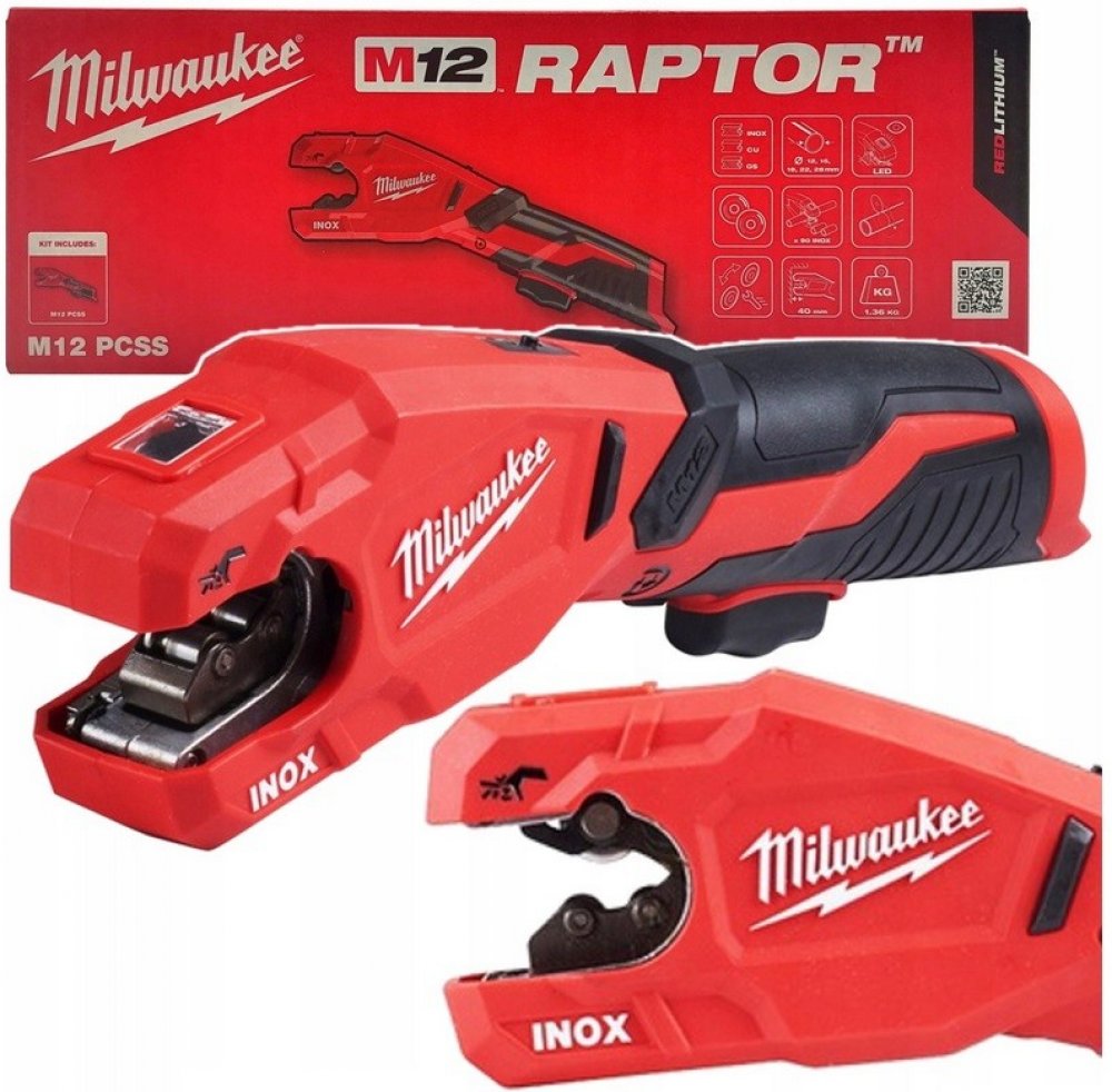 Milwaukee raptor je 12V řezák na nainstalované potrubí z nerezové oceli, uhlíkové oceli a mědi o rozměrech 12 až 28 mm.
