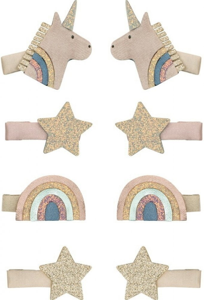 Rozkošné mini sponky s ozdobou jednorožců, duhy a hvězdiček v jemné paletě růžových a pastelových tónů promění každý účes v pohádkové dílo. Měkoučké textilní detaily zajišťují pohodlné nošení a okouzlující vzhled, který si malé parádn...