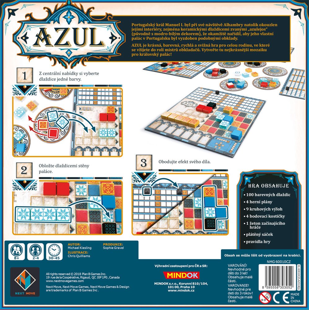 Portugalský král Manuel I. byl při své návštěvě Alhambry natolik okouzlen jejími interiéry, zejména keramickými dlaždicemi zvanými „azulejos“ (původně s modro-bílým dekorem), že okamžitě nařídil, aby jeho vlastní palác v Portugalsku byl vyzdoben podobnými obklady. AZUL je krásná, barevná, rychlá a svižná hra pro celou rodinu, ve které se vžijete do rolí mistrů obkladačů. Vytvořte tu nejkrásnější m...