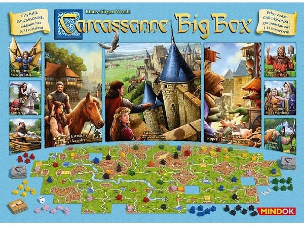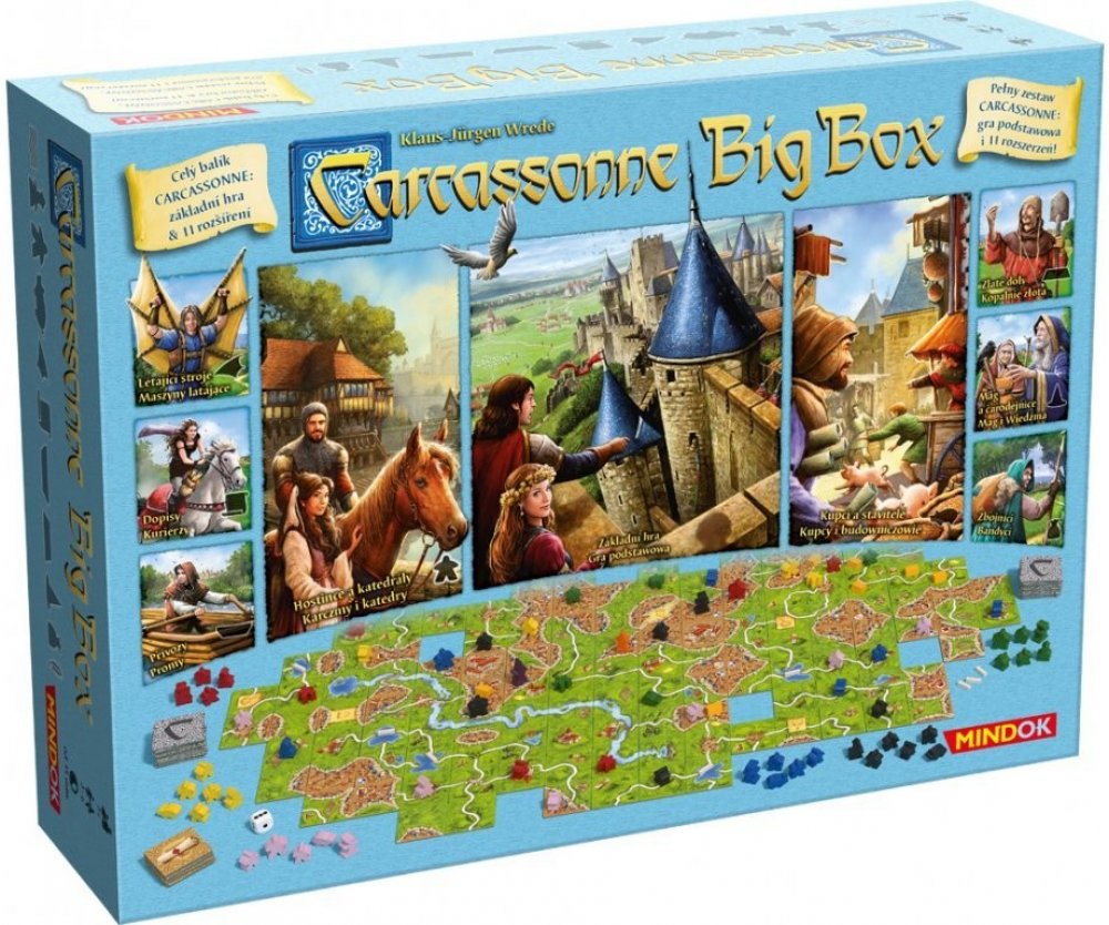 Carcassonne - BIG BOX je speciální dárkové balení již legendární společenské hry Carcassonne. Balení obsahuje vedle základní hry také dvě velká rozšíření a další bonusy.