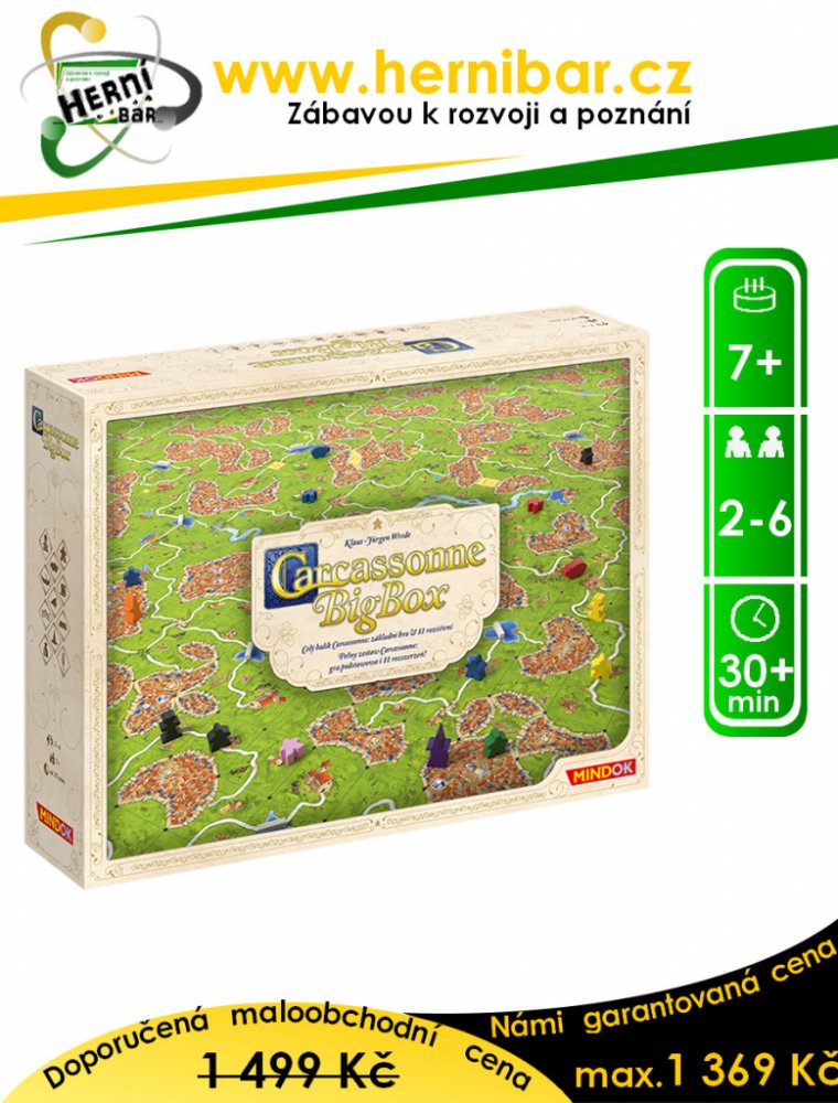 Carcassonne Big Box dělá opravdu čest svému názvu. V obrovské krabici najdete z tzv. velkých rozšíření dvě nejoblíbenější - Hostince a katedrály a Kupce a stavitele. K tomu navíc ještě šest vyhledávaných mini-rozšíření.