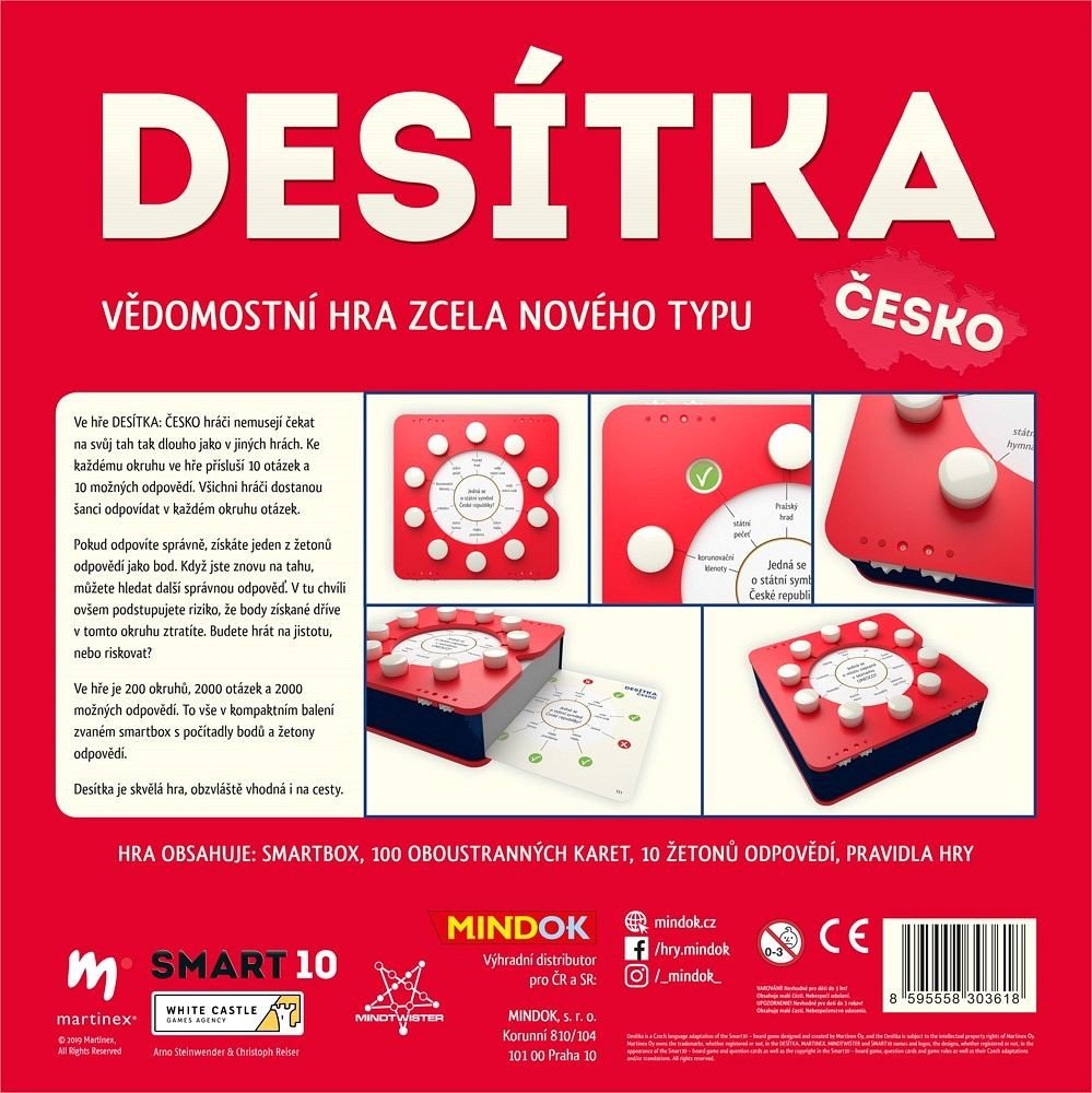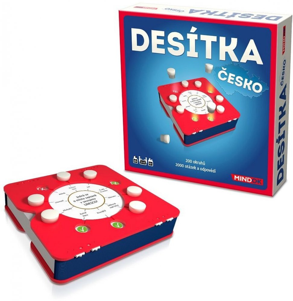 Ve hře Desítka Česko hráči nemusejí čekat na svůj tah tak dlouho jako v jiných hrách. Ke každému okruhu ve hře přísluší 10 otázek a 10 možných odpovědí. Všichni hráči dostanou šanci odpovídat v každém okruhu otázek. Pokud odpovíte správně, získáte jeden z žetonů odpovědí jako bod. Když jste znovu na tahu, můžete hledat další správnou odpověď. V tu chvíli ovšem podstupujete riziko, že body získané dříve v tomto okruhu ztratíte. Budete hrát na jistotu, nebo riskovat? Ve hře je 200 okruhů, 2000 otázek a 2000 možných odpovědí. To vše v kompaktním balení zvaném smartbox s počítadly bodů a žetony odpovědí. Desítka je skvělá hra, obzvláště vhodná i na cesty. Balení obsahuje: