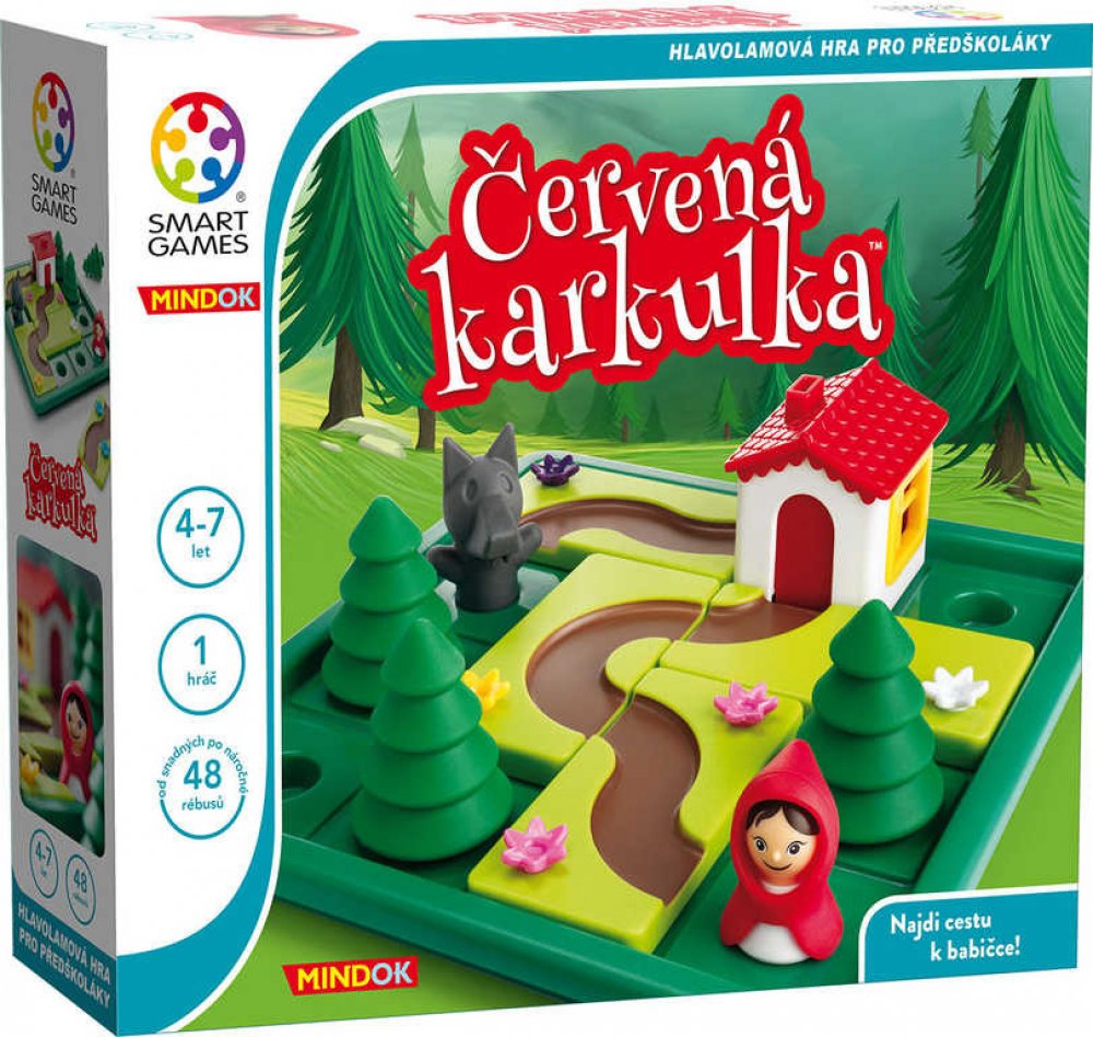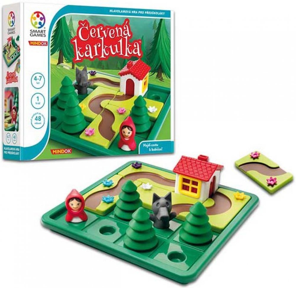 Bylo nebylo... Připomeňte si kouzlo oblíbené pohádky prostřednictvím zábavné hlavolamové hry pro předškoláky. Pomůžete Karkulce najít cestičku k babiččině chaloupce? Umístěte Karkulku, stromy a chaloupku na hrací desku a lesní pěšinku přiveďte k babiččině chaloupce. Jakmile si však si však osvojíte tuto "bezpečnou" variantu hry, vše se zkomplikuje přítomností zákeřného vlka. Pozor! Co když se k babičce dostane rychleji? V těchto úlohách je třeba vystavět dvě oddělené pěšinky. Jednou se vydá mlsný vlk, druhou důvěřivá Karkulka. Hra obsahuje 48 zadání (24 bez vlka a 24 s vlkem) a také obrázkovou knížku s netradičním zvratem tradičního příběhu.