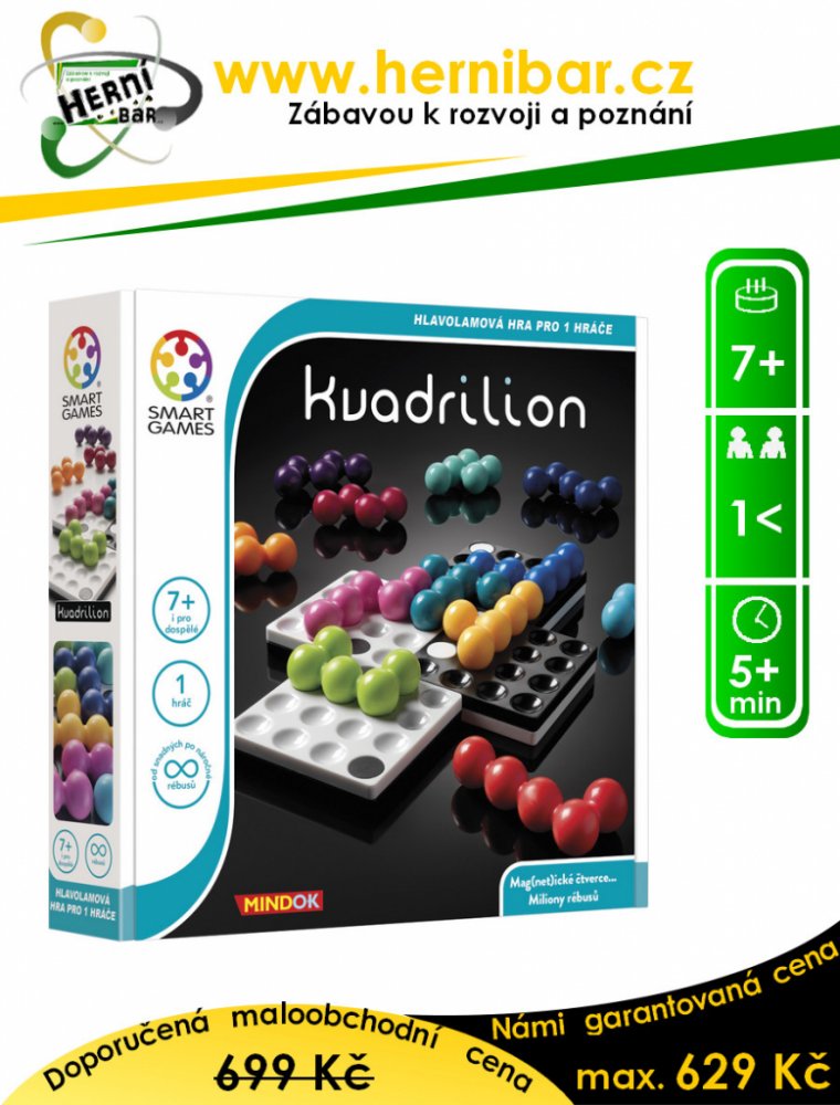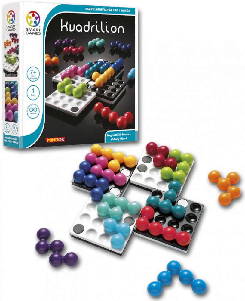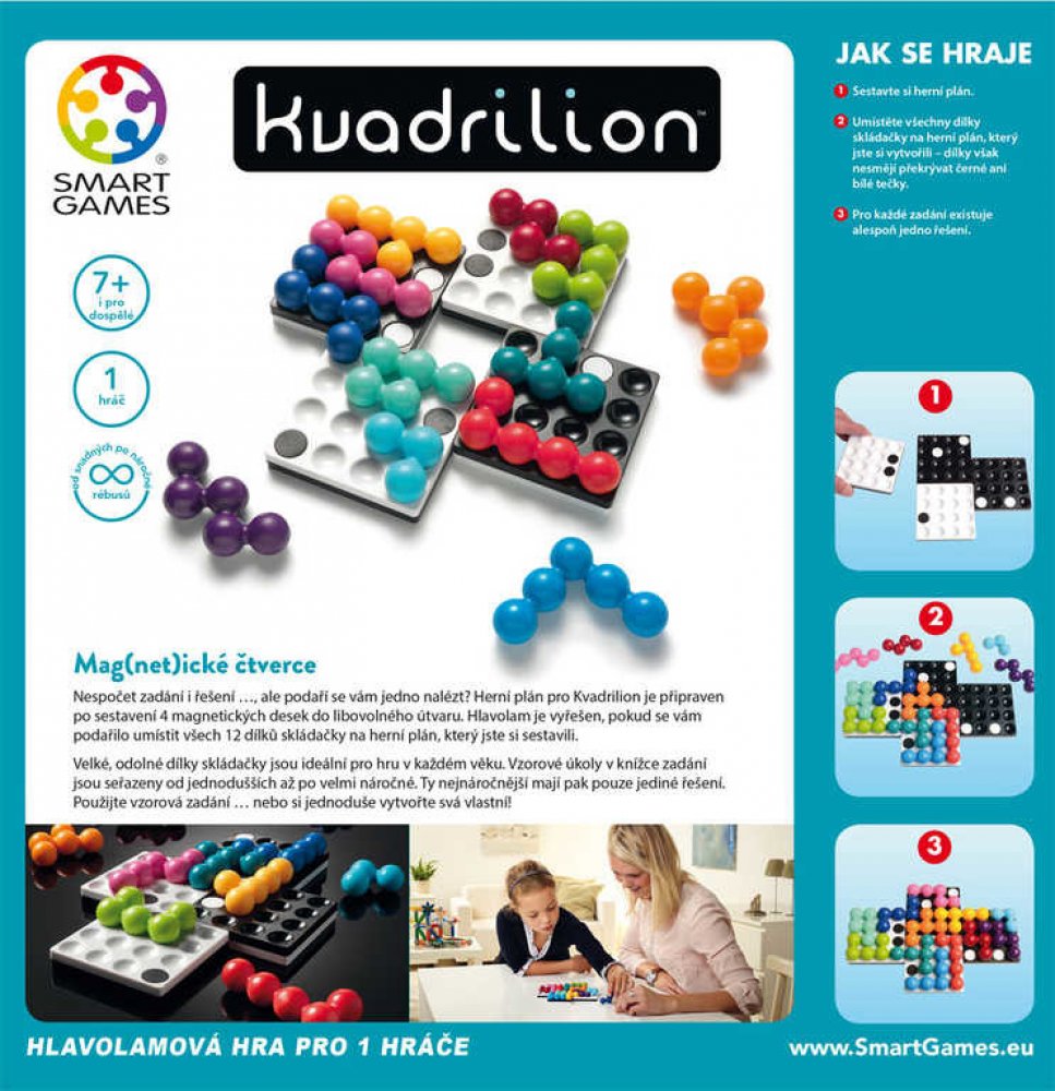 Hlavolamová hra pro 1 hráče z řady SMART games. Nespočet zadání i řešení, ale podaří se vám jedno nalézt? Herní plán pro Kvadrilion je připraven po sestavení 4 magnetických desek do libovolného útvaru. Hlavolam je vyřešen, pokud se vám podařilo umístit všech 12 dílků skládačky na herní plán, který jste si sestavili. Velké, odolné dílky skládačky jsou ideální pro hru v každém věku. Vzorové úkoly v ...