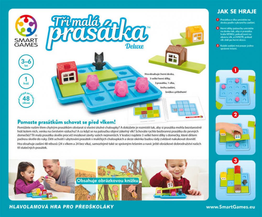 Pomůžete našim třem chytrým prasátkům obstarat si vlastní útulné chaloupky? A dokážete je rozmístit tak, aby si prasátka mohla bezstarostně hrát kolem nich, venku na čerstvém vzduchu? A co když se na paloučku objeví zákeřný vlk? Schováte rychle bezbranná prasátka do pevných domečků? Tři malá prasátka skvěle procvičí mozkové závity vašich nejmenších. V krabici najdete 3 velké puzzle dílky s domečky...