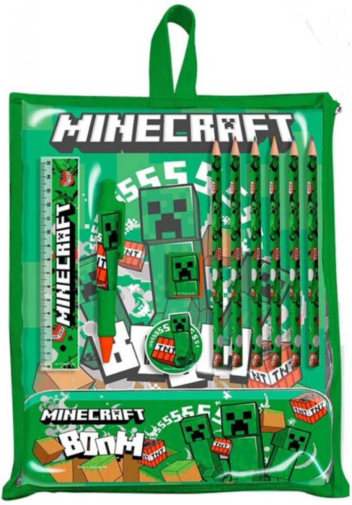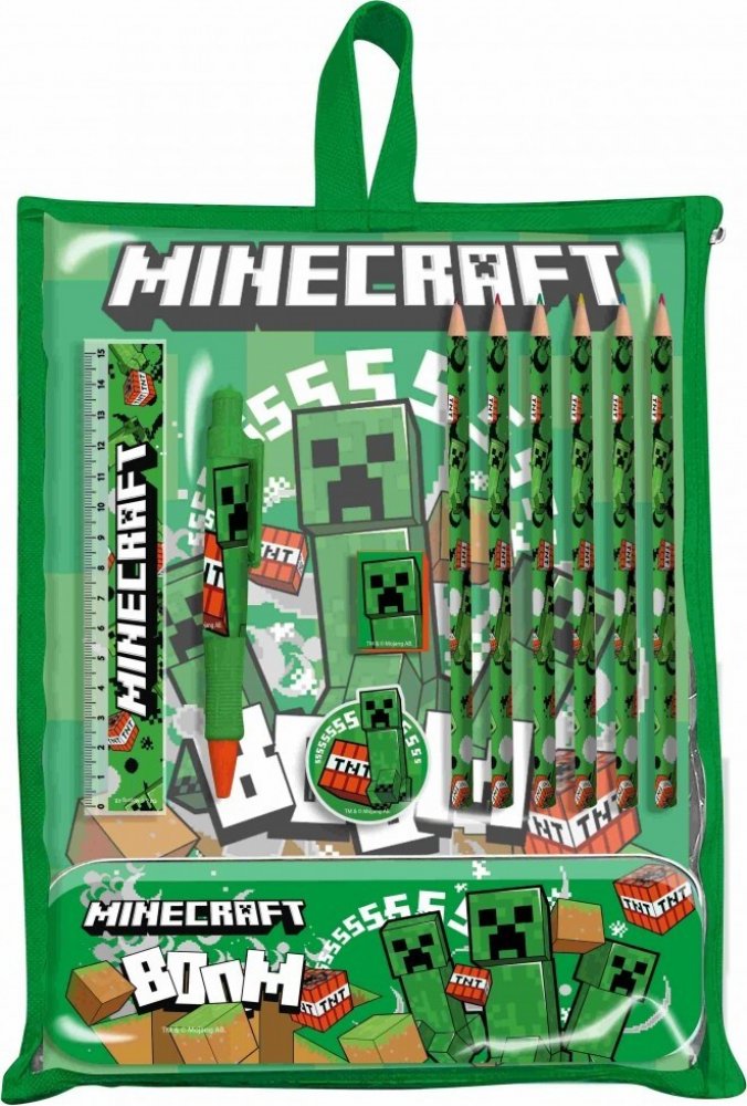 Sada školních potřeb Minecraft: Creeper Sss obsahuje pravítko, tužky, propisku, kovové pouzdro, gumu a ořezávátko, proto zahrnuje vše potřebné do školy. Hodí se pro menší i větší fanoušky Minecraftu a zejména postavy Creepera, který je vyobrazený na grafice předmětů. Využijí ji na psaní, drobné kresby i rýsování. Všechny psací pomůcky ze sady Minecraft: Creeper Sss snadno schováte do kovového pouzdra, které je zároveň ochrání.Klíčové vlastnosti sady školních potřeb Minecraft: Creeper SssSada školních potřeb Minecraft: Creeper Sss s motivem oblíbené počítačové hryObsahuje pravítko, tužky, propisku, kovové pouzdro, gumu a ořezávátkoZahrnuje vše k psaní, rýsování i drobnému kresleníVšechny psací potřeby snadno schováte do přiloženého pouzdra, které je ochráníSada školních potřeb Minecraft: Creeper Sss nadchne menší i větší fanoušky