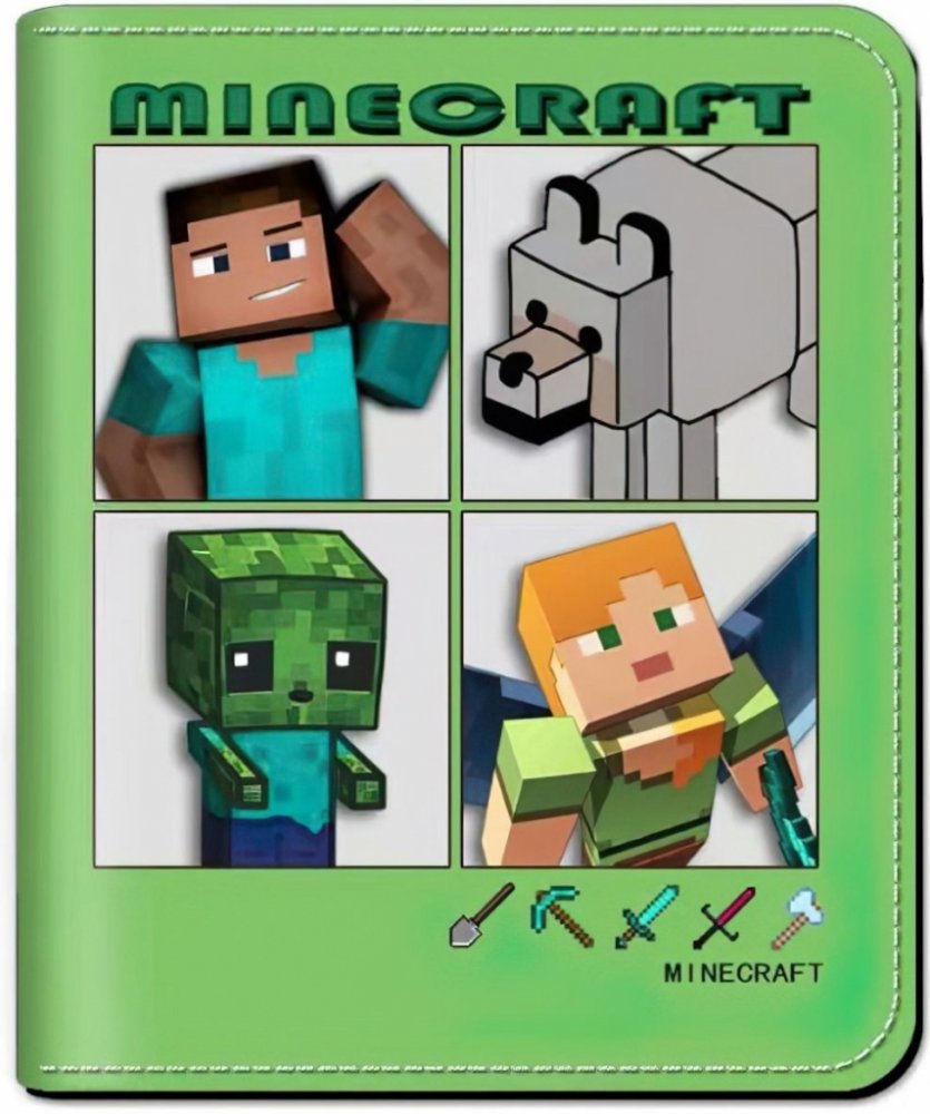 Přední stranu zdobí čtyři ikonické postavy z Minecraftu – Steve, Alex, zombie a vlk – na výrazném zeleném podkladu s nápisem a ikonami nástrojů. Tento hravý design v sobě spojuje dobrodružství a kreativitu světa Minecraft a promění každodenní používání peněženky v zábavu.