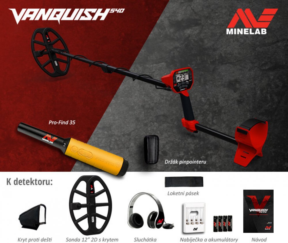 Detektor kovů Minelab Vanquish 540 SET. Vanquish 540 je velice přívětivý pro ovládání detektor. Nabízí 5 vyhledávacích režimů (mince, šperky, relikvie, vlastní, všechny kovy) a možnosti nastavení diskriminace, hlasitosti či citlivosti. Nechybí ani funkce Pinpoint nebo možnost připojení bezdrátových sluchátek.
