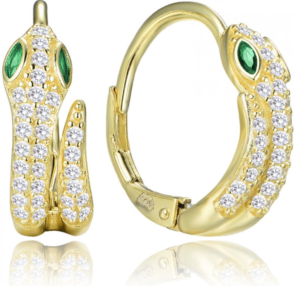 Šperky MINET spojují jemnost, kvalitu a elegantní výraz. Náušnice jsou vyrobeny z pravého stříbra Ag 925/1000 pokoveného vrstvou 14k zlata. Mají motiv hada a zdobí je bílé a zelené zirkony. Zapínání je řešeno patentem pro bezpečné nošení.
