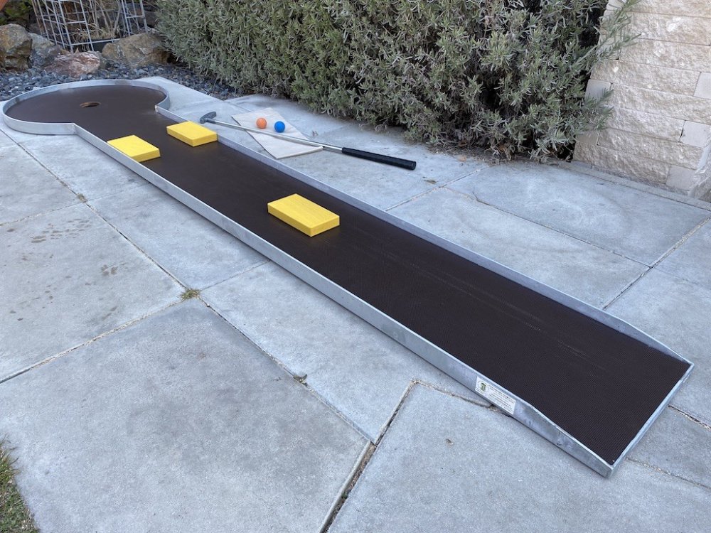 - Rozměry minigolfové dráhy: délka 2,5m, šířka 0,3m, průměr kruhu 0,6m.