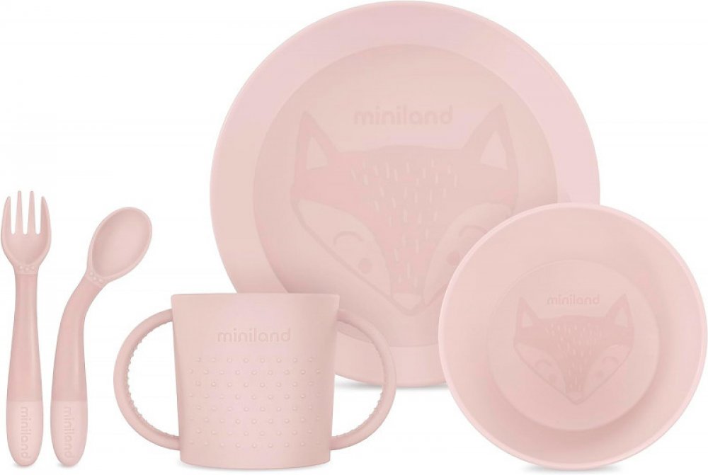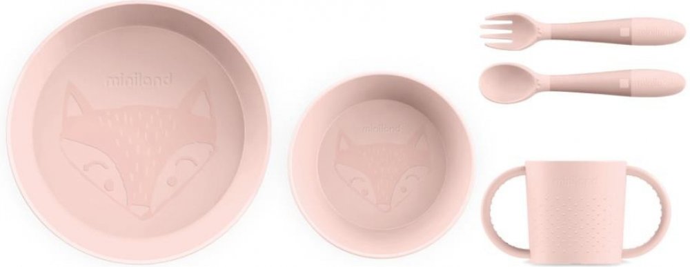 Jídelní sadu tvoří talíř, miska, hrnek se 2 uchy, pružná lžička a vidlička. Talíř i miska s vysokými okraji pomáhají snadnému nabírání pokrmu. Lžička a vidlička jsou vyrobeny z flexibilního příjemného materiálu a mají neklouzavá, kulatá držadla, která usnadňují dítěti držení. Hrnek se dvěma uchy pomáhá dítěti naučit se pít z klasického hrnku.
