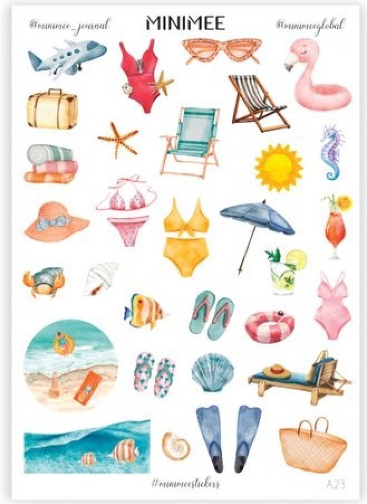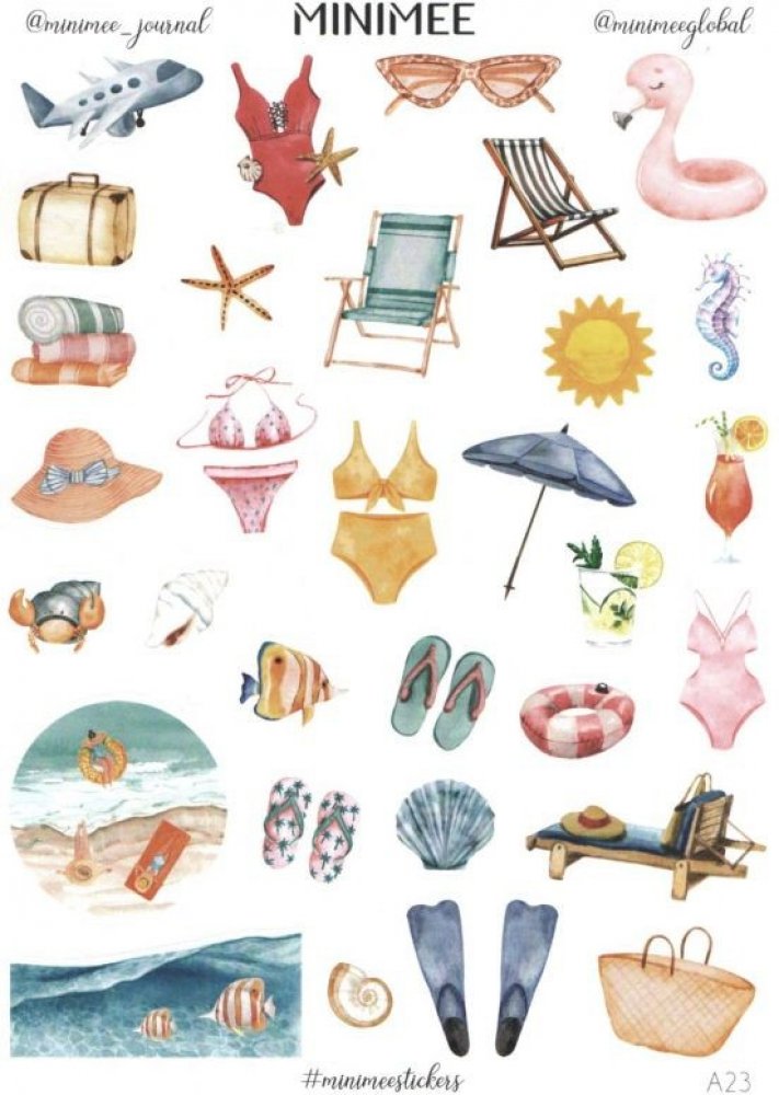 \nVyřezávané samolepky s motivy moře, dovolené u moře, odpočinku, slunění se a všeho dalšího, co k odpočinkové dovolené patří.\nSamolepky v aršíku A5 se perfektně hodí k tečkovaným zápisníkům MINIMEE