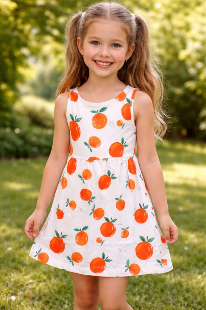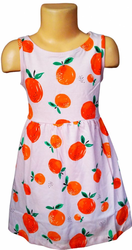 Krásné a veselé letní šaty, které dívky využijí v teplých letních dnech a to do města, do školy, na doma i zahradu. V pase je velmi pružná guma, která neškrtí a umožní dostatečně volný pohyb při běžných denních aktivitách našich dětiček. Motivy pomerančů jsou látkové a šatičky mají velmi pohodlný střih. Materiál: 100% bavlna Tabulka velikostí v cm - orientačně Velikost Délka Pas max 104/110 5...