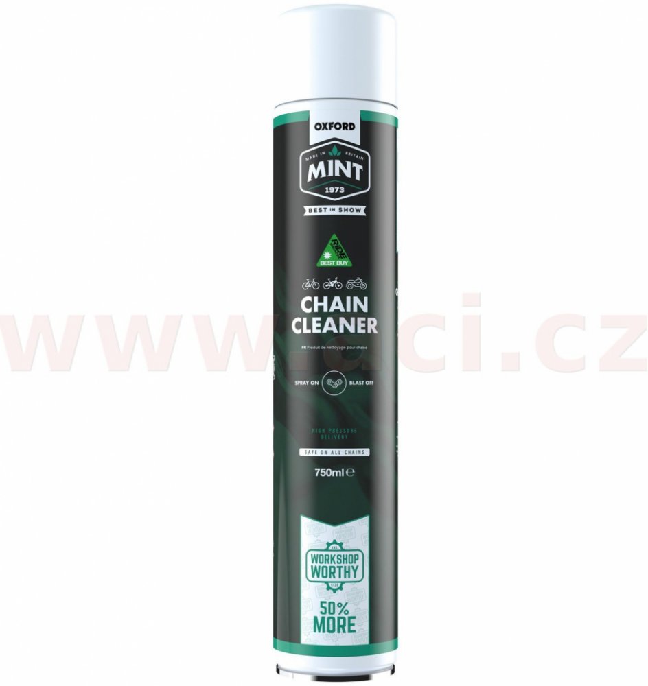 Emulzní látka ve složení čističe dovoluje, aby bylo možné povrch řetězu kompletně opláchnout před aplikací nového maziva na řetězy. Produkt z řady položek moto/cyklo sortimentu značky MINT pro čištění. Aroma s vůní máty. Balení o objemu 750 ml pro dílenskou spotřebu.