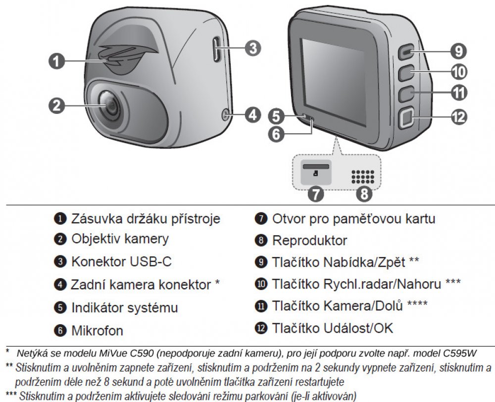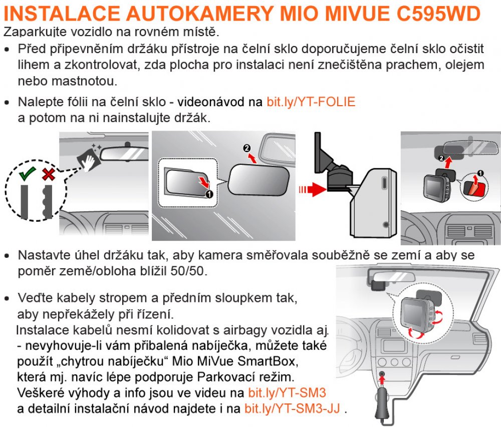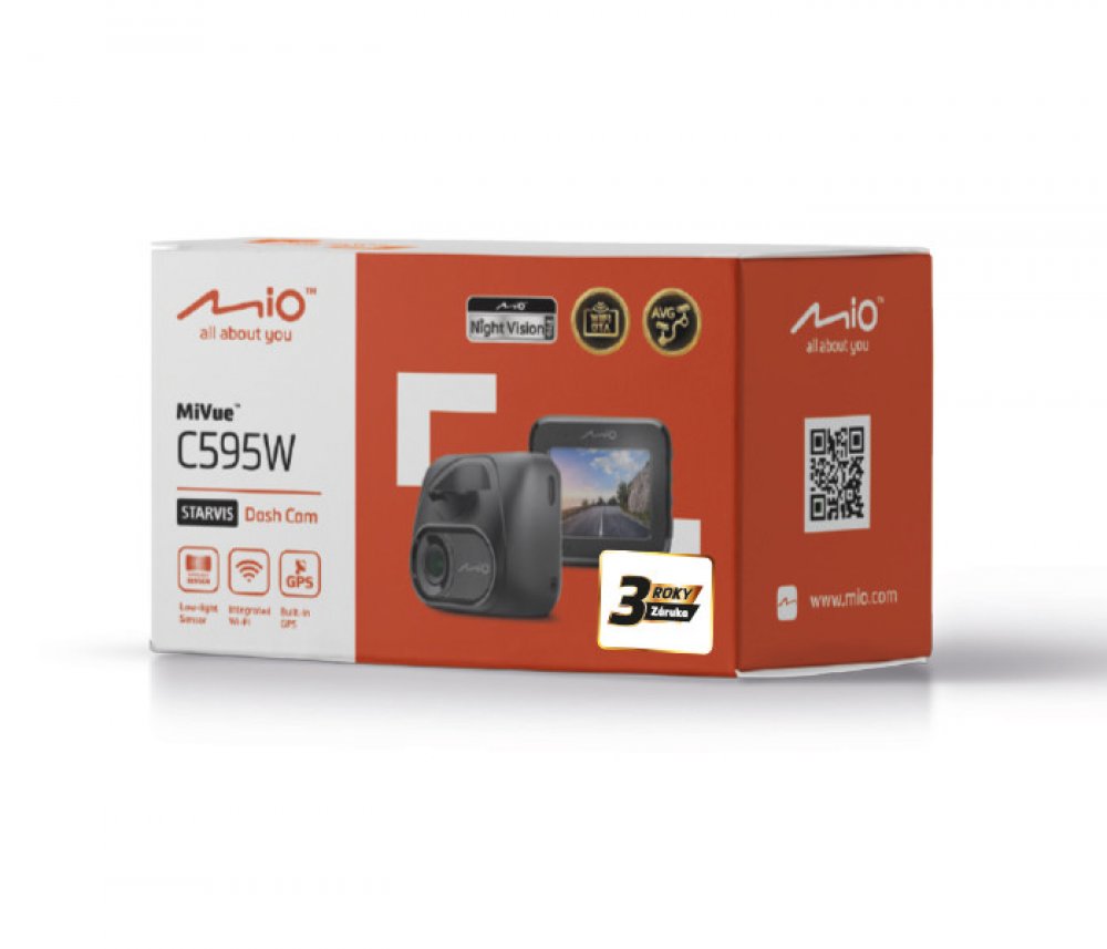 Balení: MiVue C595W, lepící držák , statická nálepka na sklo, nabíječka do auta, návod