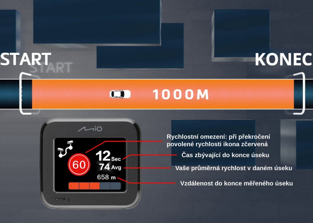 MiVue™ C595W zobrazuje vzdálenost a čas (vteřiny) k rychlostní kameře a rovněž poskytuje informaci o omezení rychlosti a průměrnou rychlost intervalu.