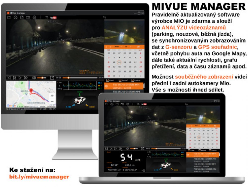 Mio MiVue™ Manager – PC software pro přehrávání a analýzu videa a informací z G-Senzoru (rychlost, směr a intenzita nárazu), sdílení na sociálních sítích