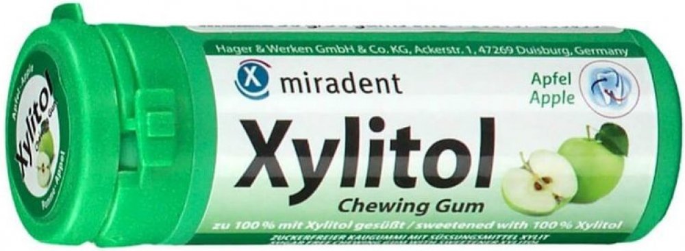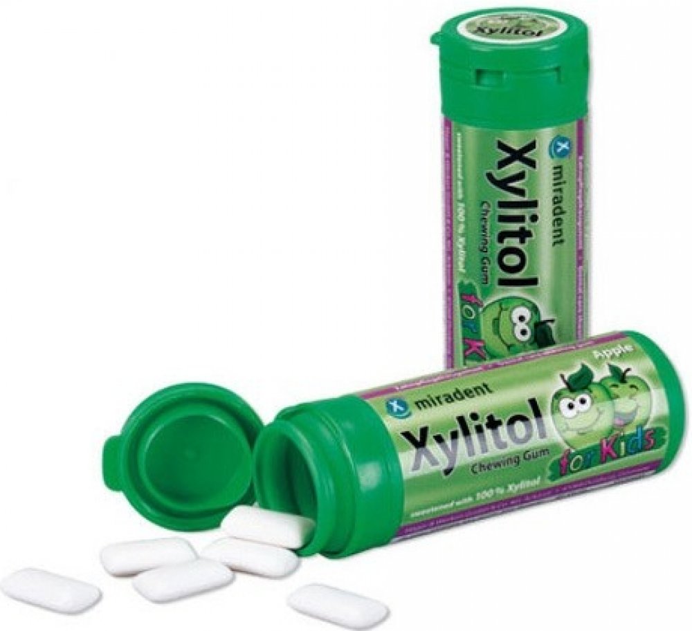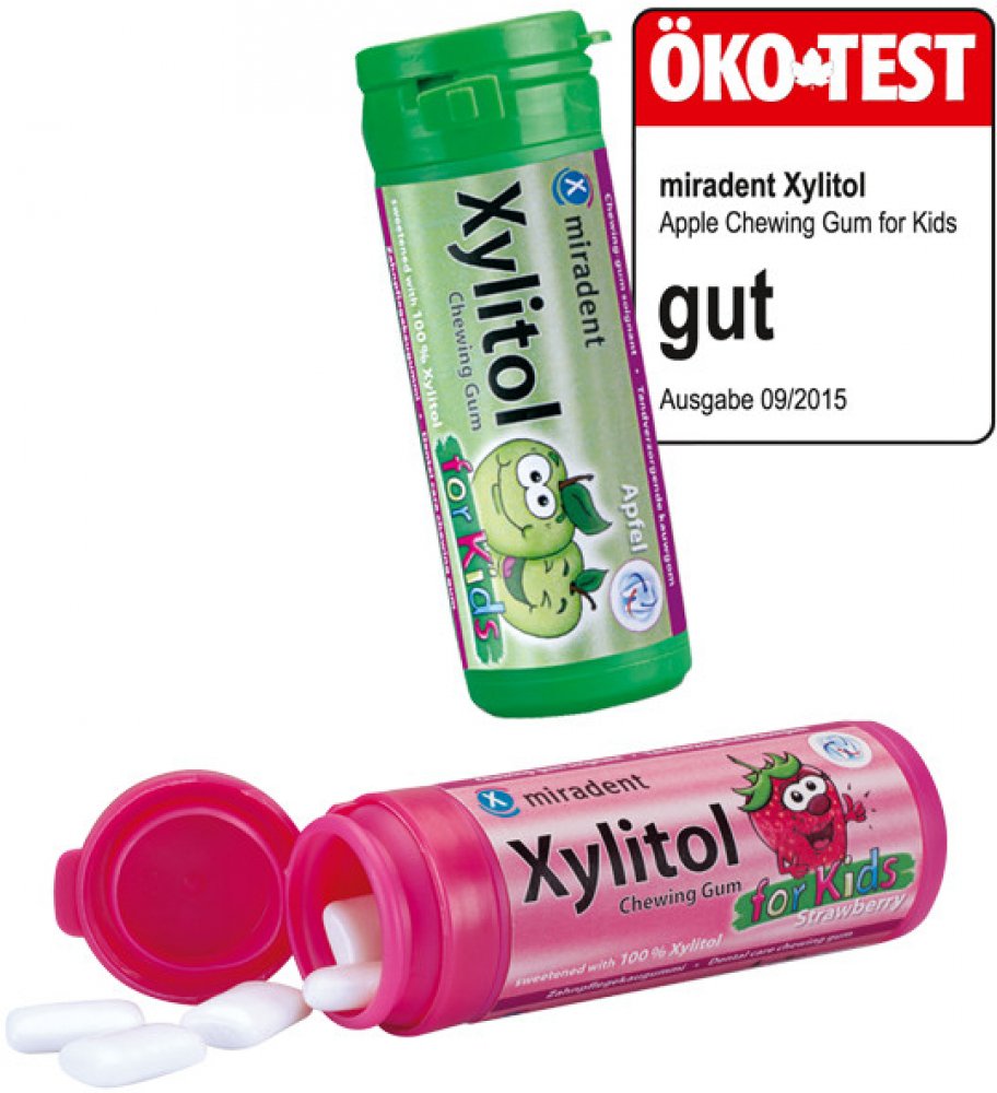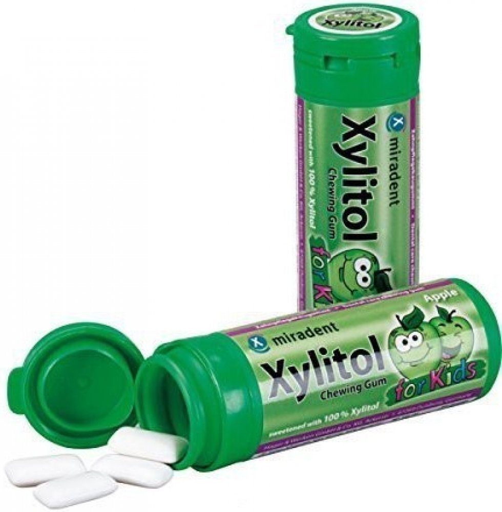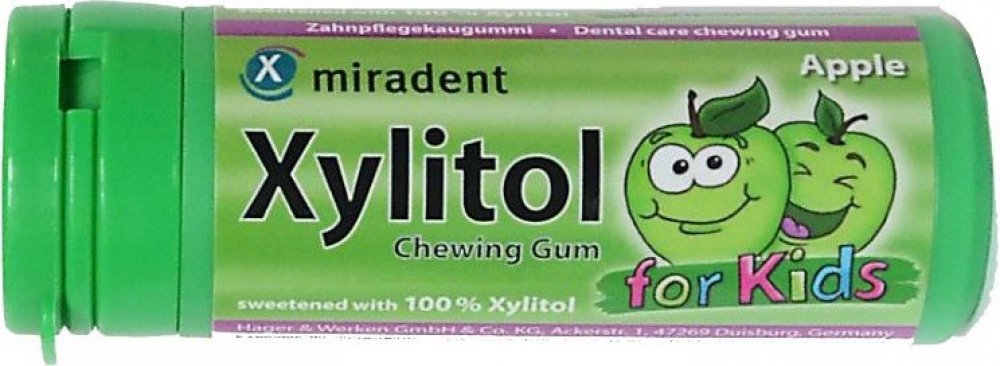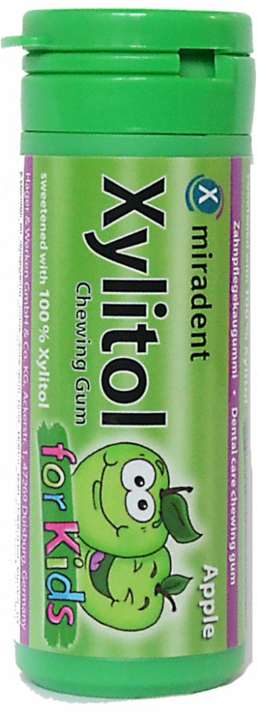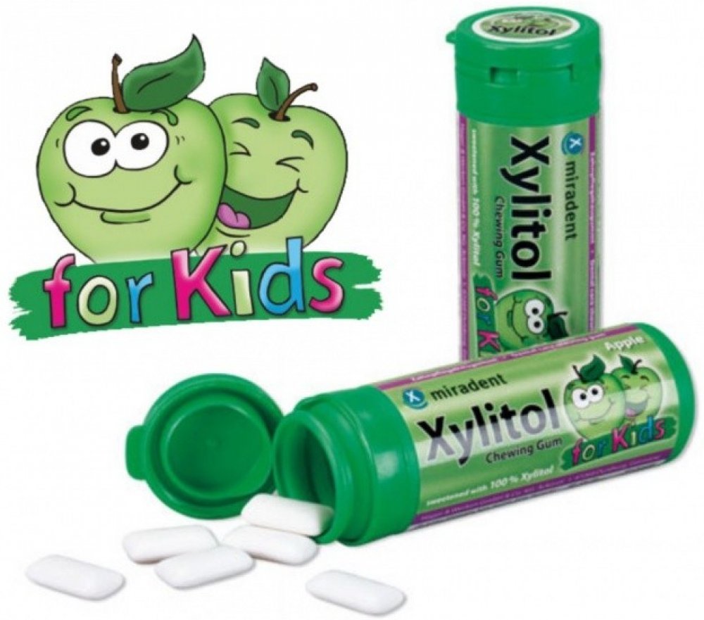 Miradent Kids žvýkačky jsou profesionální pomůckou při péči o dětský chrup. Žvýkačky s příchutí jablka osvěží dech, postarají se o zdravější ústa a bubliny budou zdrojem zábavy. Žvýkačky obsahují přírodní cukr xylitol, který je znám pro své pozitivní účinky na dutinu ústní. Žvýkačky Miradent Kids neobsahují přidané cukry, sorbitol, aspartam ani fruktózu, jsou tedy vhodné i pro diabetiky. Neobsahují ani lepek či laktózu a použitý xylitol je bez GMO.