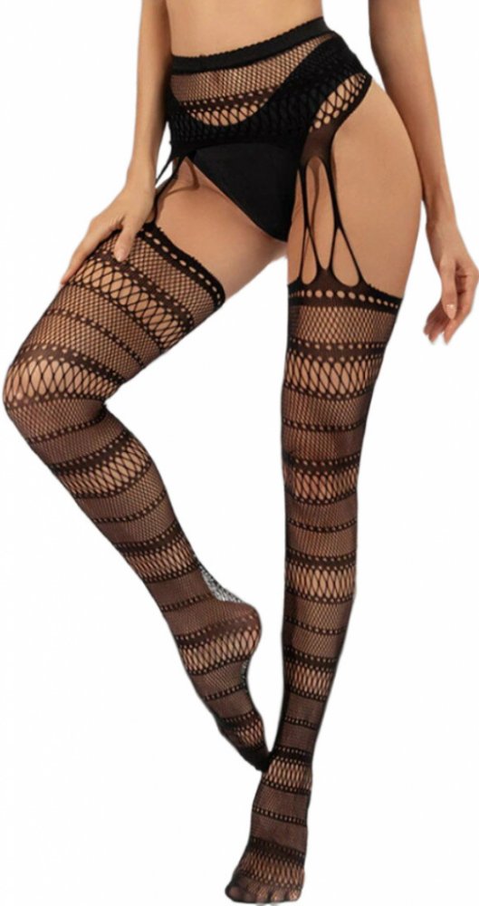 Černé síťované erotické punčochy s efektními výstřihy ve stylu podvazkových pásů. Díky černé barvě punčoch v nich bude žena vypadat dokonale a sexy. Kalhotky na fotografii nejsou součástí punčoch.