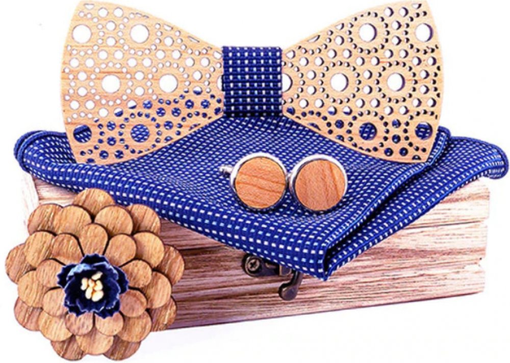 Designový motýlek z přírodního materiálu pro každého moderního muže. Originální provedení v kombinaci dřeva a textilu. Motýlek je ozdoben vyřezáváním. Součástí setu je také kapesníček, manžetové knoflíčky a brož ve tvaru květu.
